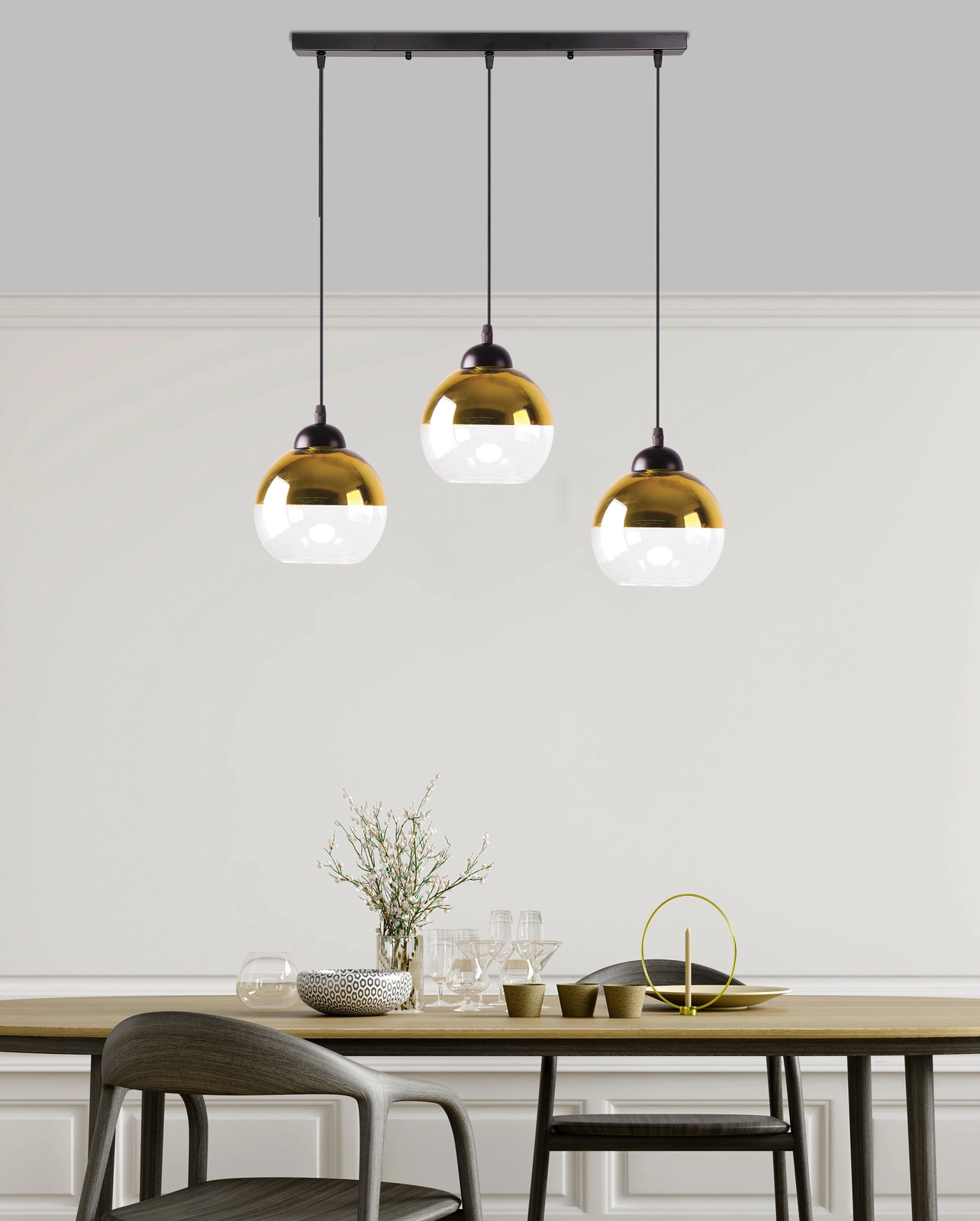 - Zlaté zrcadlové stínidlo na horní straně a průhledné sklo na spodní straně vytvářejí jedinečný efekt, který dodá interiéru šmrnc.