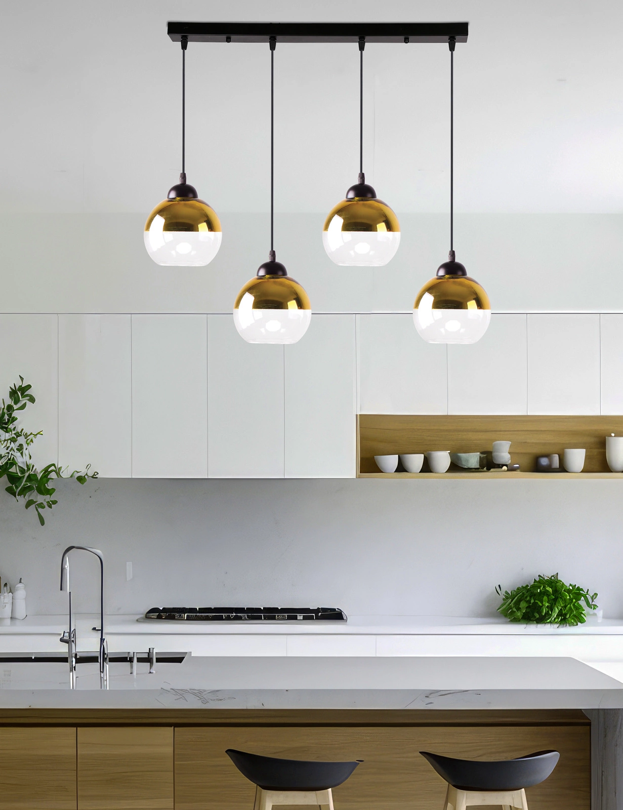 Závěsná lampa Contessa je kombinací moderního stylu se zlatým akcentem, který dodá vašemu interiéru noblesní charakter. Čtyři skleněné stínidla ve tvaru kuliček rovnoměrně rozptylují světlo a zajistí pohodlné osvětlení i větších prostor. Je to perfektní volba jako lustr do obývacího pokoje, závěsné svítidlo nad jídelní stůl nebo závěsná lampa do kuchyně – zkrátka tam, kde se cení elegance a komfort při používání.