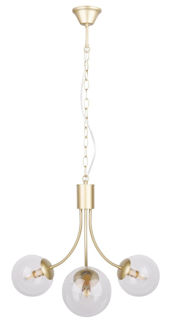 Závěsná lampa koule Dani je skvělou volbou pro ty, kteří hledají výrazné, ale přitom jemné stropní osvětlení. Tři skleněné, průhledné koule opticky zvětšují prostor a rovnoměrně rozptylují světlo, čímž vytvářejí příjemnou a útulnou atmosféru. Zlatá konstrukce podtrhuje luxusní charakter lampy a skvěle ladí s moderním i glamour zařízením. Tento lustr přitahuje pozornost a stává se ústředním bodem každé místnosti.