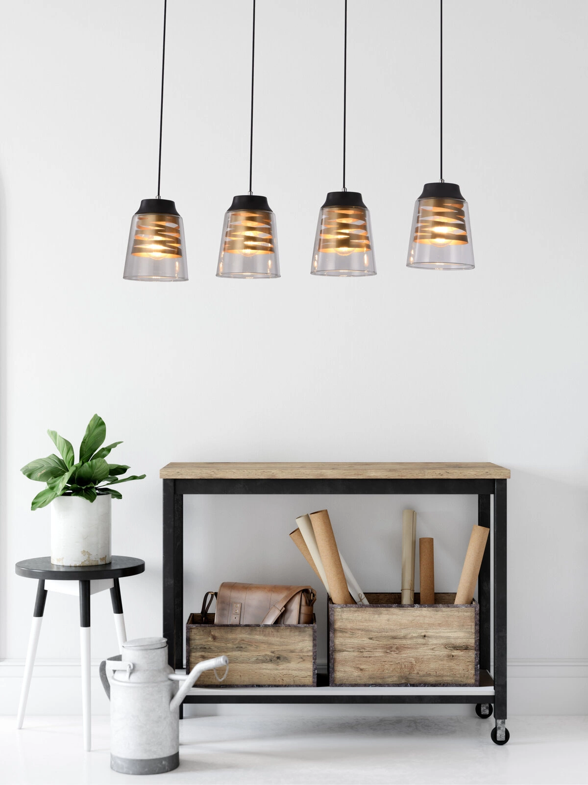 Kombinace skleněného stínidla a robustní ocelové konstrukce zaručuje nejen atraktivní vzhled, ale i dlouhou životnost. Průhledná stínidla jemně rozptylují světlo a vytváří příjemnou atmosféru bez oslňování. Černá stropní základna a minimalistické linie lampy podtrhují její moderní charakter a dělají z ní výrazný dekorativní prvek v každém interiéru.