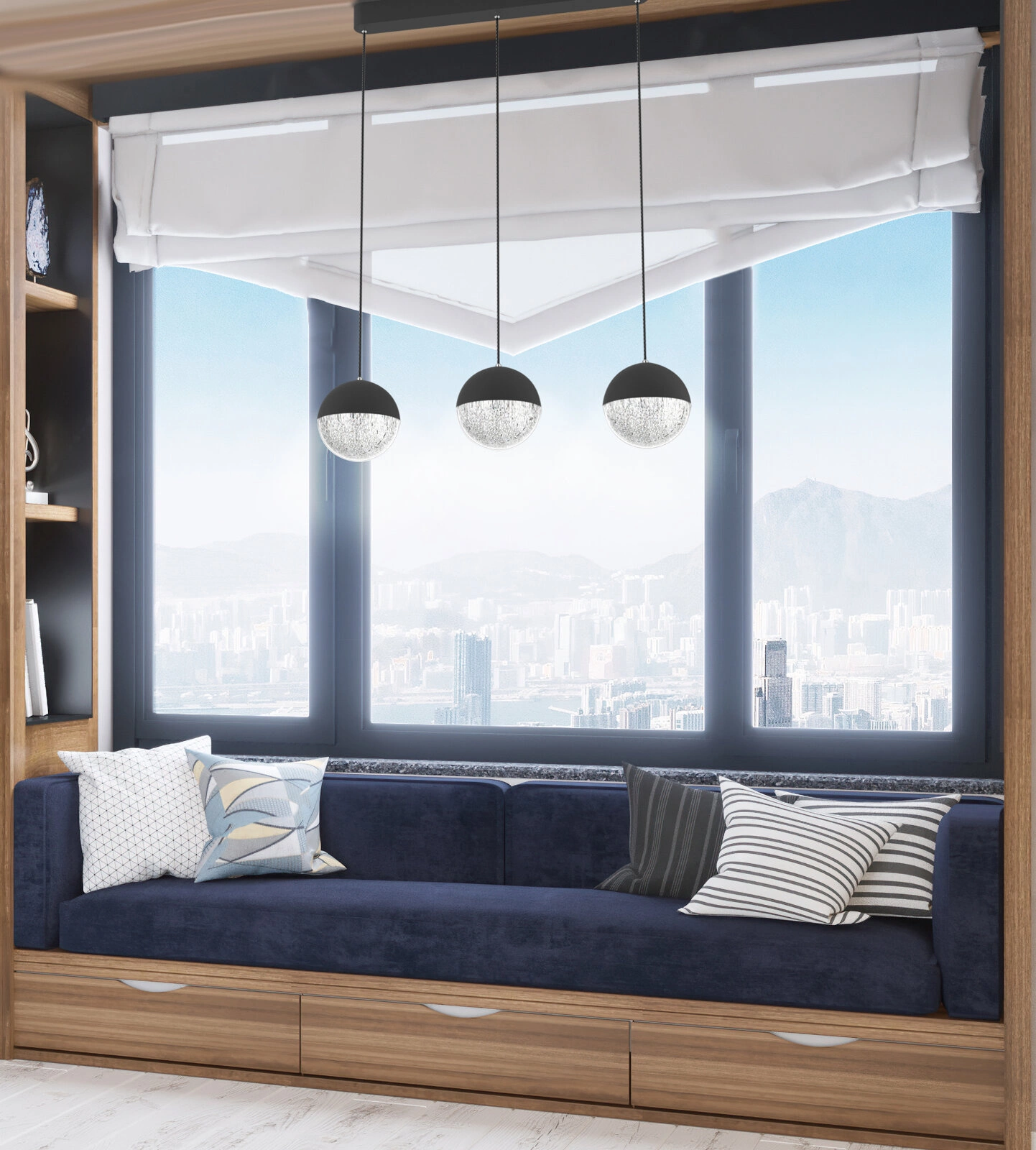 - Skleněná stínidla ve tvaru koulí – působivý vzhled a jemné rozptýlení světla