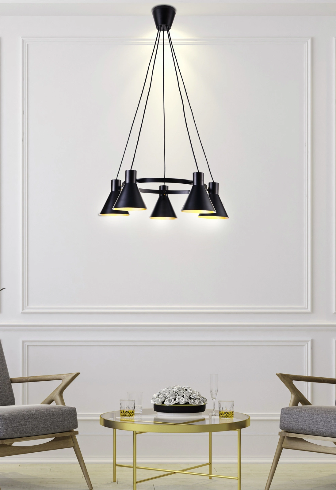 Závěsná lampa More osloví minimalistickým tvarem a výrazně moderním vzhledem, díky čemuž skvěle zapadne jak do obývacího pokoje, tak do kuchyně nebo jídelny. Pět černých stínidel tvoří harmonický celek, zatímco zlaté detaily uvnitř jemně podtrhují eleganci svítidla. Kovová konstrukce zaručuje dlouhou životnost i snadnou údržbu – stačí stínidla otřít vlhkým hadříkem, aby si zachovala perfektní vzhled po mnoho let.