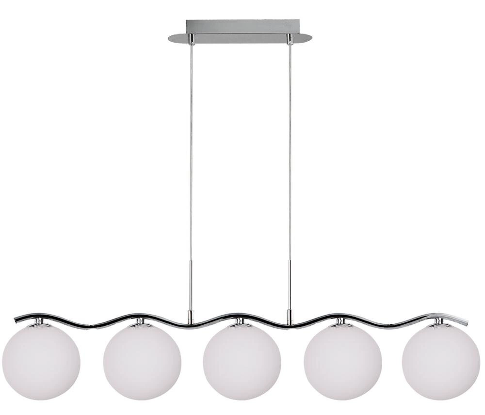 Závěsná lampa Ramon od značky Candellux Lighting je moderní stropní osvětlení o šířce 86 cm, které kombinuje sklo a chromovanou ocel. Tento pětibodový lustr v bílé barvě zaujme minimalistickým designem a zajišťuje rovnoměrné, působivé osvětlení prostoru. Díky univerzálnímu stylu je ideální jako lampa do obývacího pokoje, nad jídelní stůl, do kuchyně nebo dokonce ložnice.