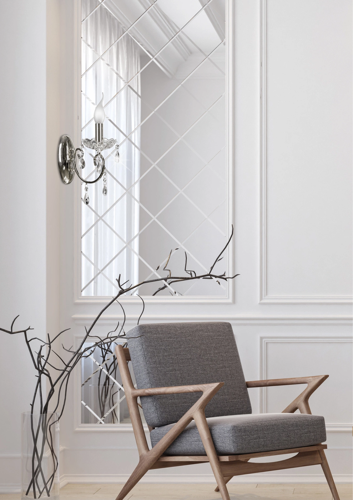 Chromová barva dodává nástěnné lampě Aurora nejen eleganci, ale také všestrannost. Dokonale se hodí k různým stylům interiéru - od klasického po moderní. Je ideální do banketních sálů, svatebních síní, ale i do elegantně zařízených obývacích pokojů nebo jídelen.