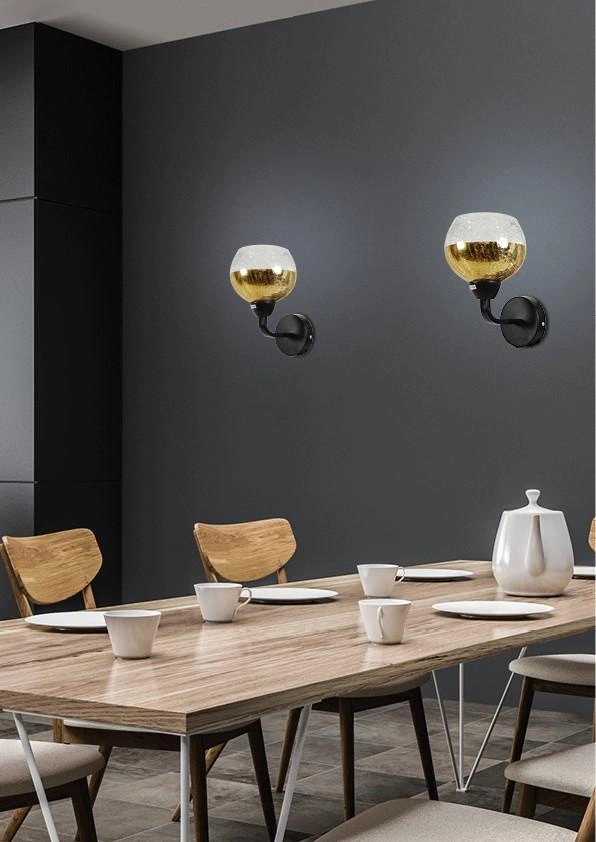 - Moderní styl a ušlechtilé barvy – černo-zlatá povrchová úprava a průhledné stínidlo dělají z této lampy jedinečný nástěnný prvek