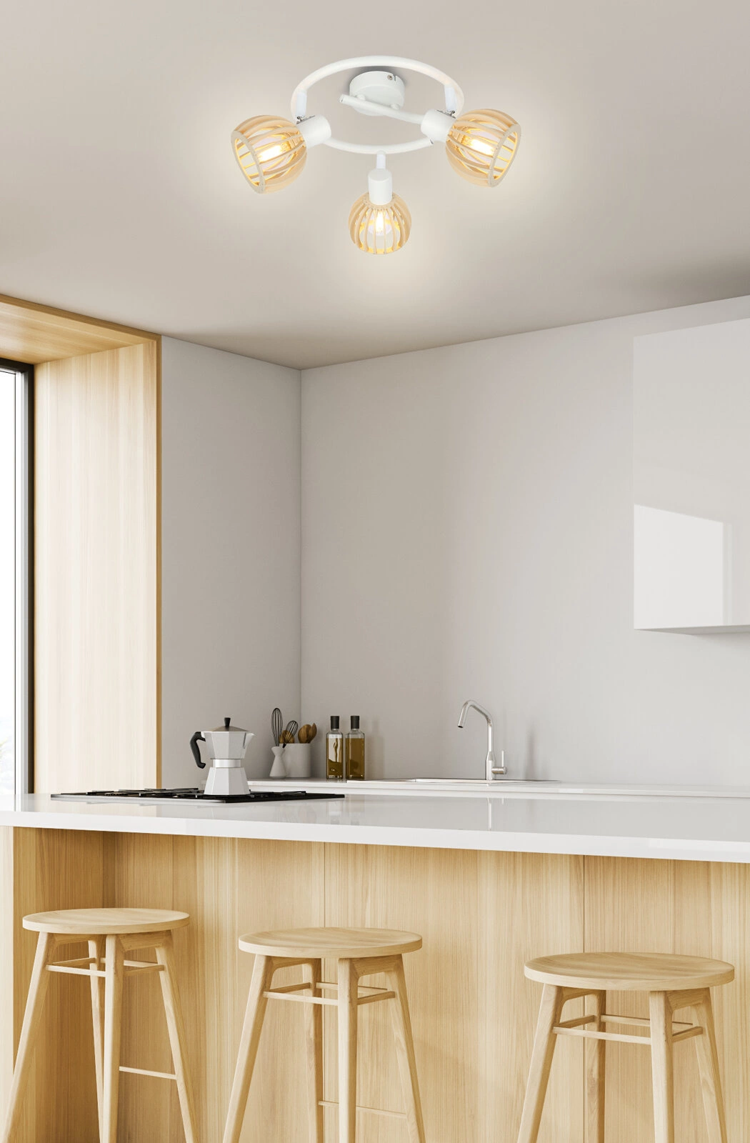 Stropní lampa Atarri spirala perfektně zapadá do oblíbeného skandinávského stylu, okouzluje jednoduchostí tvaru a teplými přírodními prvky. Bílé části harmonicky ladí s dřevěným zakončením stínidel a vnášejí do interiéru útulnost a optickou svěžest. Otevřená, vzdušná konstrukce umožňuje světlu volně proudit po místnosti a vytvářet jedinečnou atmosféru jak nad jídelním stolem, tak v obývacím pokoji nebo kuchyni.