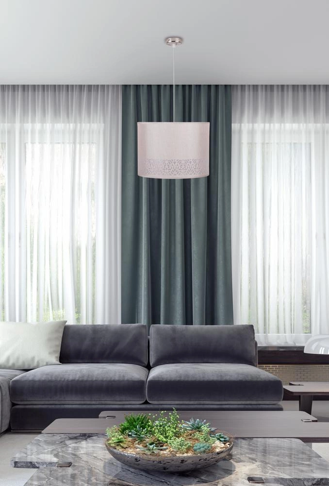 Krémový stínidlo lampy Arabesca upoutá pozornost svým světlým, měkkým povrchem, který vnáší do interiéru lehkost a harmonii. Textilie na stínidle jemně filtruje světlo, eliminuje oslňující efekt žárovky a umožňuje užívat si příjemné osvětlení každý večer. Pokud hledáte závěsné svítidlo do obýváku, jídelny nebo ložnice, které nenaruší styl vašeho interiéru, ale naopak jej doplní, je tato lampa ideální volbou. Krémová barva se snadno kombinuje s různými styly – od moderního, přes skandinávský až po klasické interiéry.