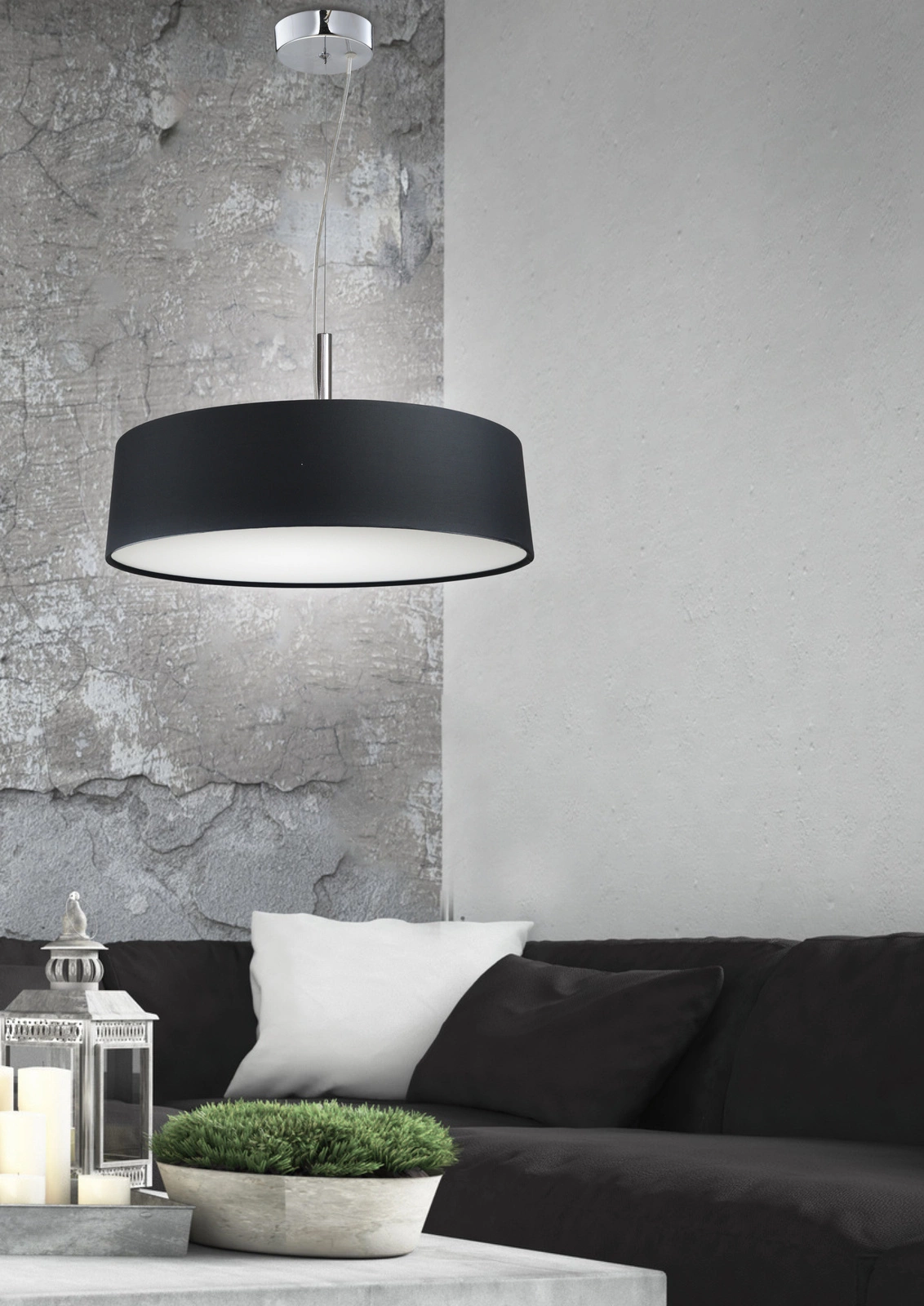 moderní a mimořádně funkční závěsné svítidlo; stínidlo z jednobarevné tkaniny, zevnitř vyztužené PCV, zespodu kryté estetickou mřížkou; celek je zavěšen na exkluzivním závěsu s chromovaným podhlavníkem a ozdobnou trubkou nad stínidlem; výškově nastavitelné; k dispozici ve 3 barvách
