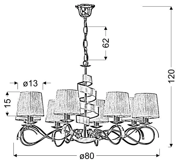 Závěsná lampa Denis glamour od značky CANDELLUX LIGHTING je ztělesněním elegance ve stylu glamour. Tento model s působivou šířkou 80 cm kombinuje zlatou kovovou konstrukci s osmi bílými textilními stínidly, což zajišťuje jedinečný světelný i dekorativní efekt. Nastavitelná výška zavěšení (až do 120 cm) umožňuje přesně přizpůsobit lampu jak do obývacího pokoje, tak do ložnice nebo jídelny.