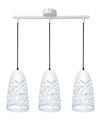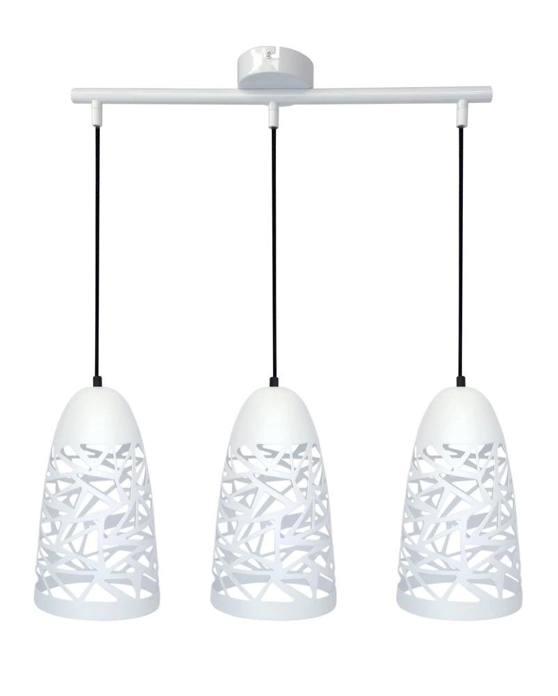 jemná verze kovového závěsného svítidla v podkroví; dekorativní kovové stínidlo - dole otevřené - dokonale osvětlí moderní kuchyňské interiéry i interiéry pro mládež; celé udržované v bílých barvách; zavěšené na černých lanech umožňujících nastavení výšky; pro sadu závěsných svítidel 1 a 2