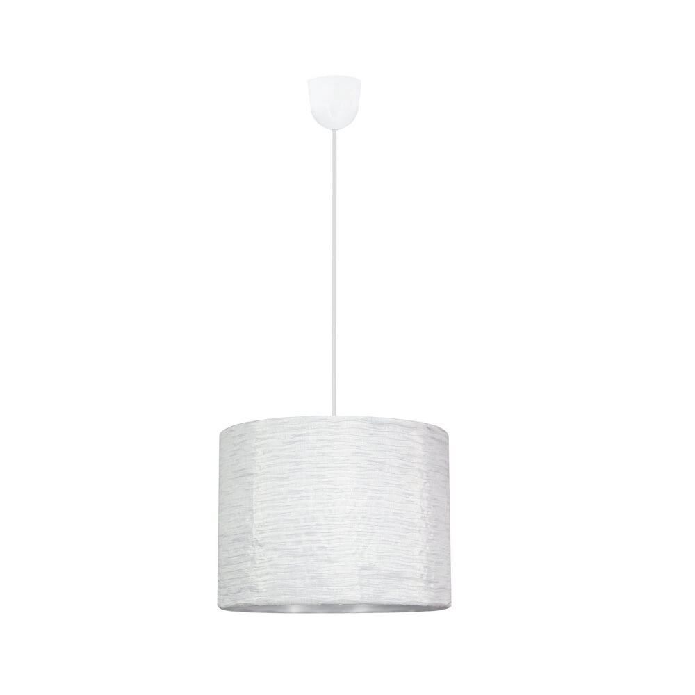 netradiční stínidlo z lesklé plisované látky na PVC nosiči; zavěšené na průhledném závěsu se saténovým nadpražím a stropním sloupkem