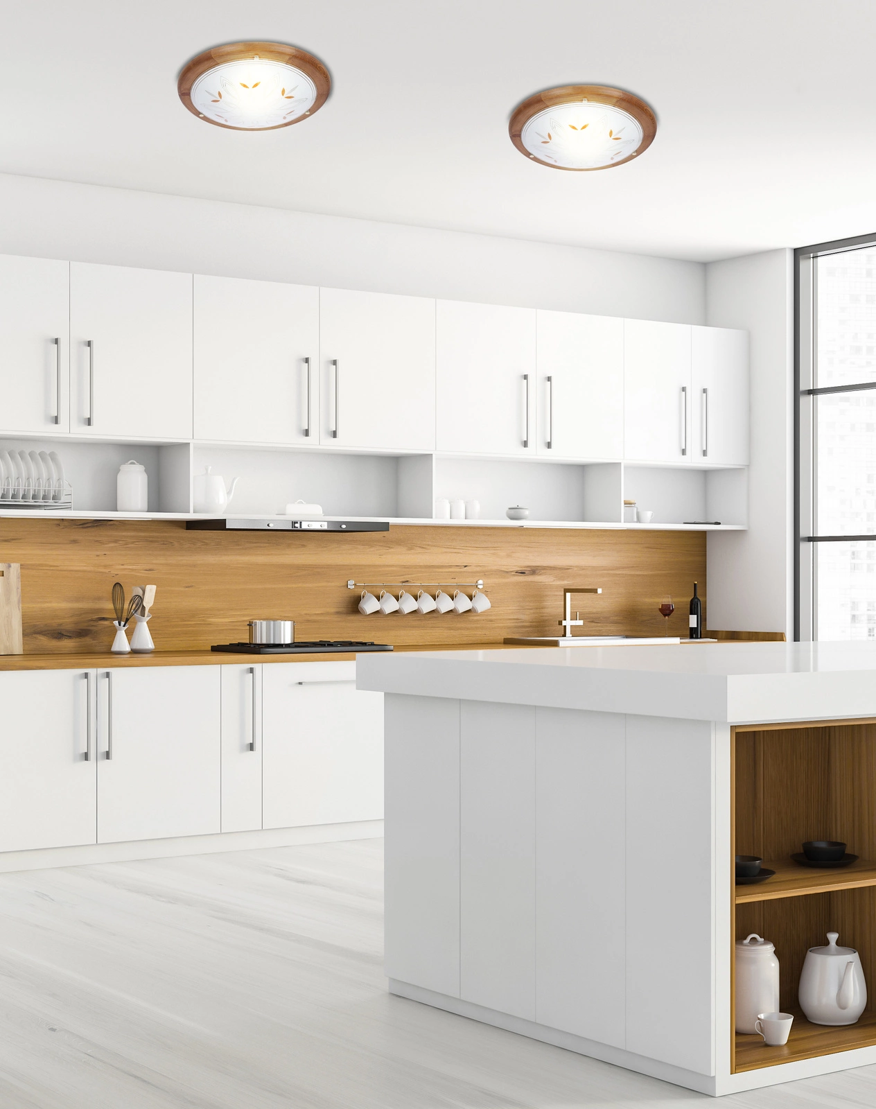 stropní svítidloBarevné provedení u Rustica 40 je kombinací bílé a přírodního dubu. stropní svítidlo Díky tomu dokonale zapadne do každého interiéru bez ohledu na převládající barevné schéma. Bílý odstín na vnitřní straně zajišťuje optimální rozptyl světla, zatímco přírodní barva dřeva dodává interiéru teplo a útulnost.