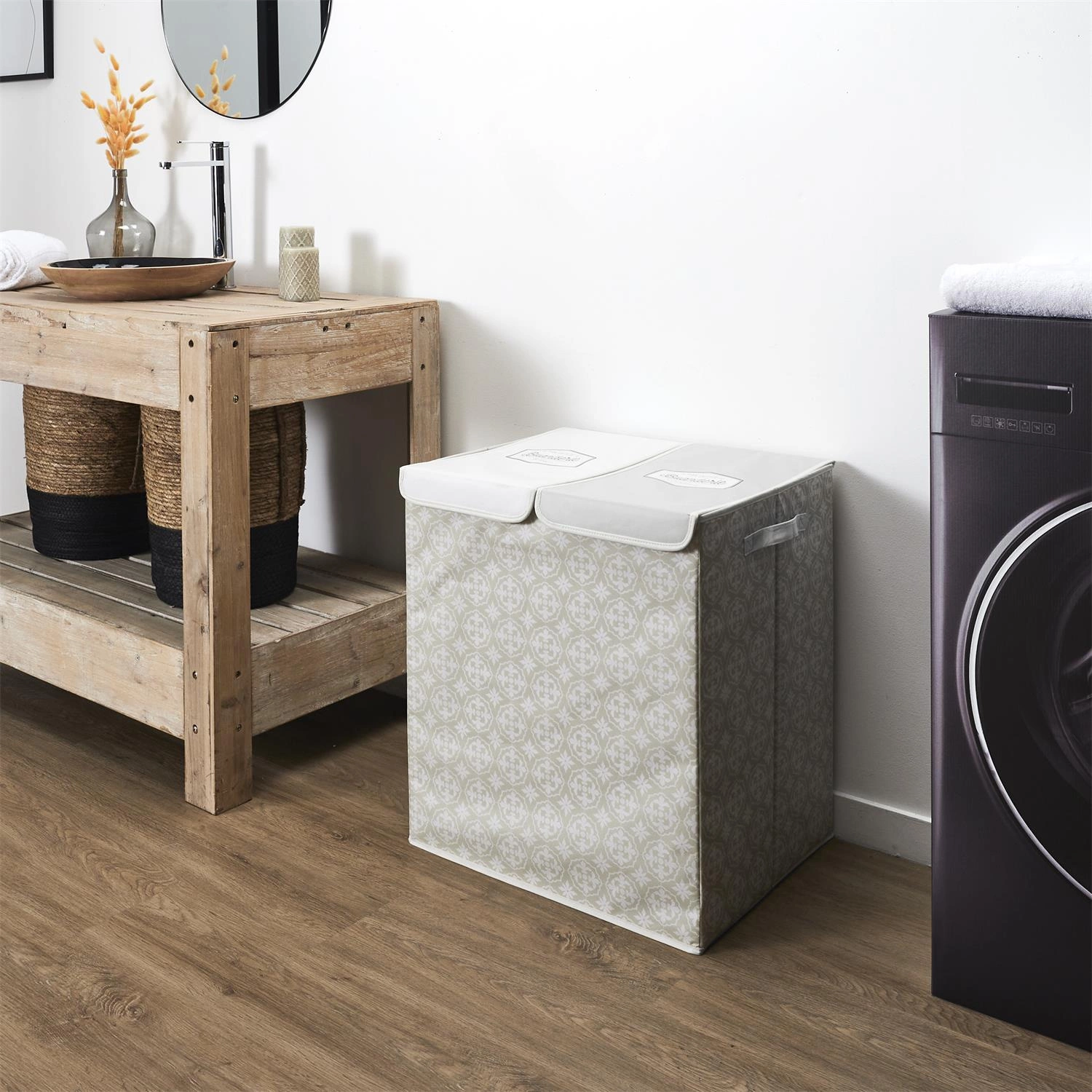 Dvoukohompartmentový koš na prádlo s víkem od značky Intesi je moderní a praktické řešení pro každou koupelnu. Vyrobený z odolné textilie v šedém odstínu umožňuje pohodlné třídění prádla díky dvěma samostatným komorám. Skládací konstrukce a kompaktní rozměry 50×41×57 cm zajišťují, že koš je ideální i do malých prostor.