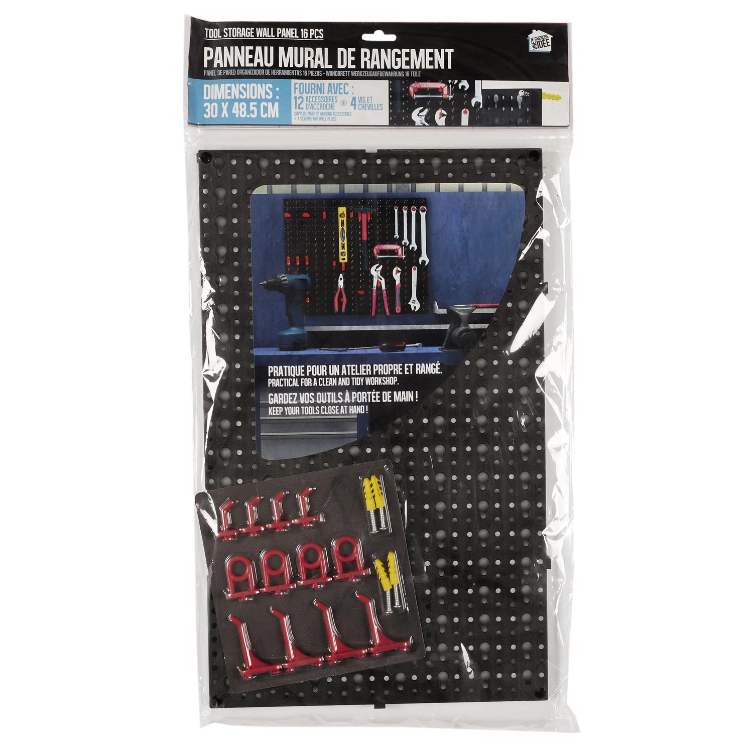 Nástěnný věšák Intesi je moderním a praktickým řešením do garáže nebo dílny, které vám umožní maximálně využít prostor na stěně. Vyrobený z odolného polypropylenu, vyniká univerzální černou barvou a obdélníkovým tvarem. Panel o šířce 48,7 cm a hloubce 30 cm nabízí až 16 míst pro nářadí, takže každodenní organizace práce je jednodušší a efektivnější.