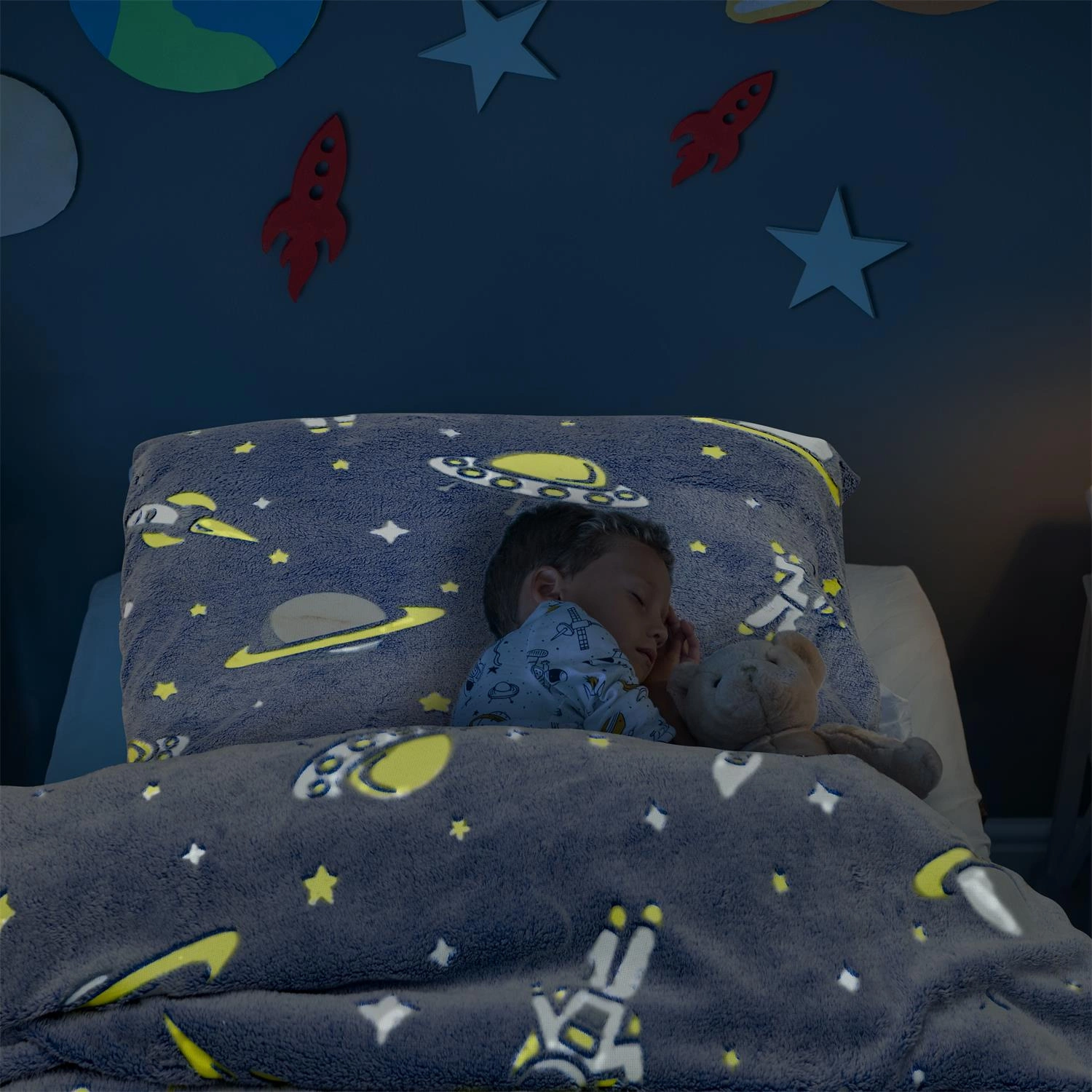 Toto dětské povlečení s vesmírným motivem promění každodenní usínání v dobrodružství mezi planetami, raketami a hvězdami. Největším lákadlem je svítící vzor ve tmě, který jemně prosvětluje pokoj a vytváří magickou atmosféru pro klidný spánek. I děti, které se bojí tmy, se díky tomu budou cítit bezpečně a pohodlně ve své posteli.