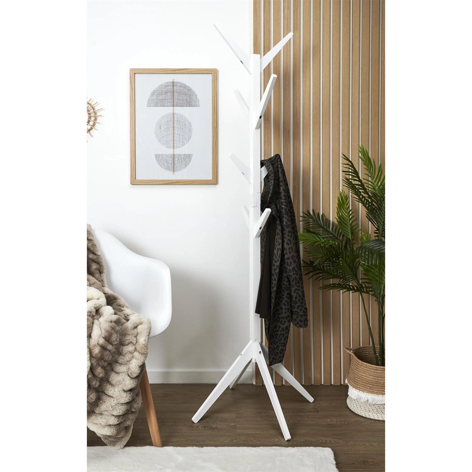 Díky stabilní samostatně stojící konstrukci a promyšlenému rozmístění ramen umožňuje věšák Intesi Tree pohodlné zavěšení kabátů, bund, tašek nebo šál. Snadno si zorganizujete každodenní nepořádek a každému kousku oblečení najdete své místo – bez nutnosti vrtání do zdi nebo zabírání cenného prostoru na policích. Ideální jako věšák na bundy do předsíně i praktický stojan na oblečení do šatny či čekárny.