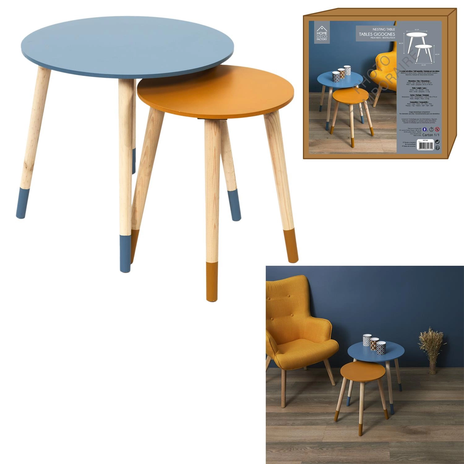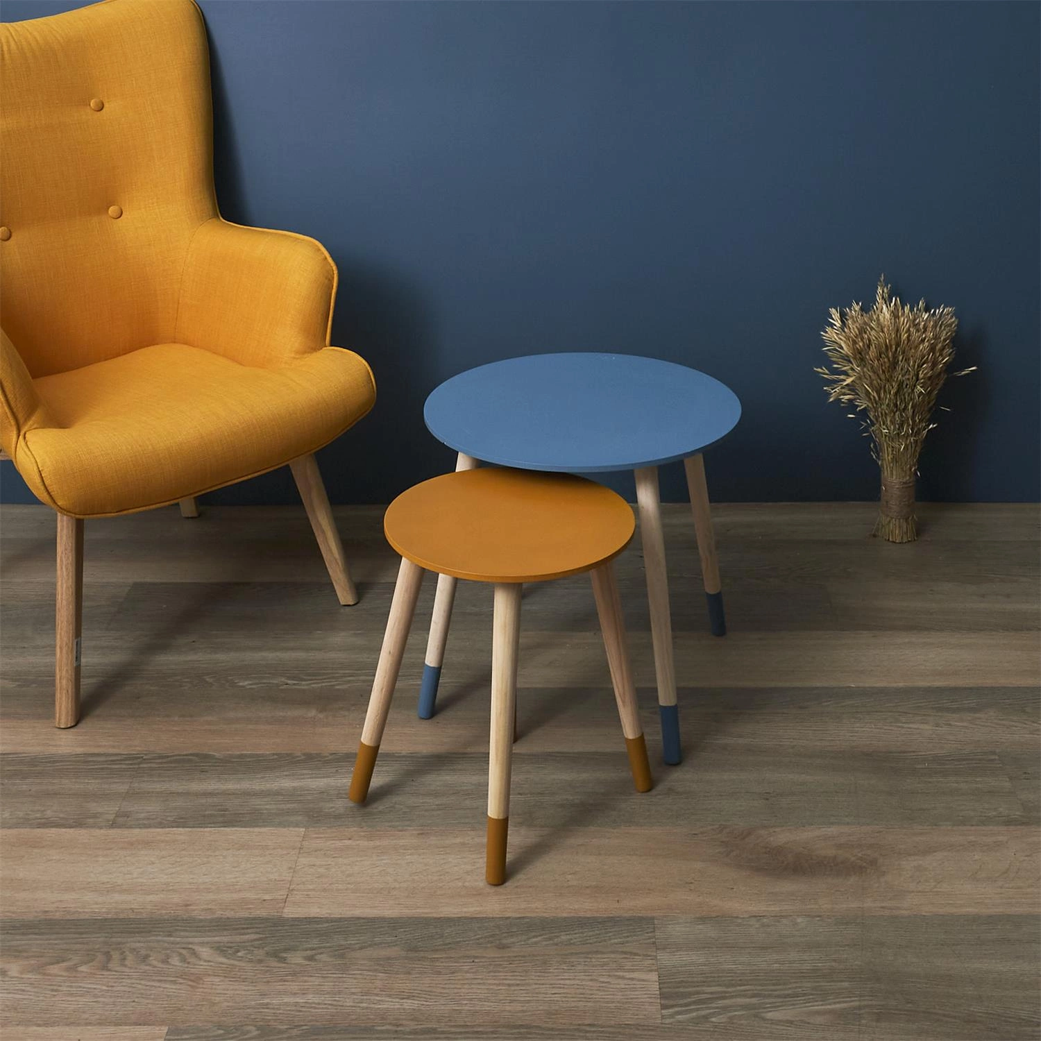 Sada 2 kulatých konferenčních stolků Trundle Intesi je ideální volbou pro ty, kteří ocení moderní design, praktičnost a nadčasovou severskou estetiku. Každý stolek je navržen s ohledem na pohodlí při používání – větší o rozměrech 48×43 cm a menší 40×33 cm – což umožňuje snadné uspořádání v obývacím pokoji, jídelně i kuchyni. Charakteristické je spojení přírodního borovicového dřeva s barevnými deskami v odstínech hluboké modři a energické oranžové.Konferenční stolky Trundle – moderní design a praktické využití