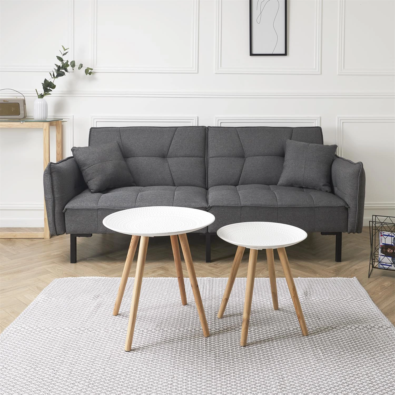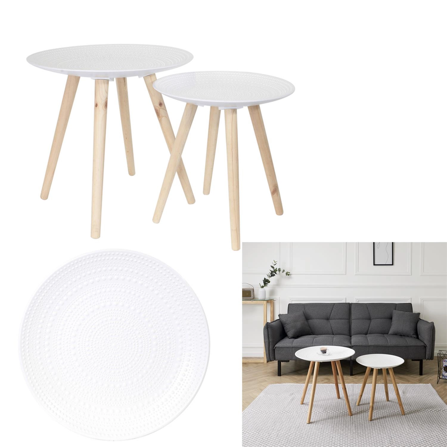 Kombinace bílé desky a přírodního odstínu dřeva je klasikou skandinávského stylu, která vnáší do interiéru lehkost a svěžest. Kulatý tvar stolků zajišťuje bezpečné používání a skvěle ladí s moderním, severským i loftovým zařízením. Jemný, ale výrazný design je také skvělým základem pro stylové dekorace a doplňky.