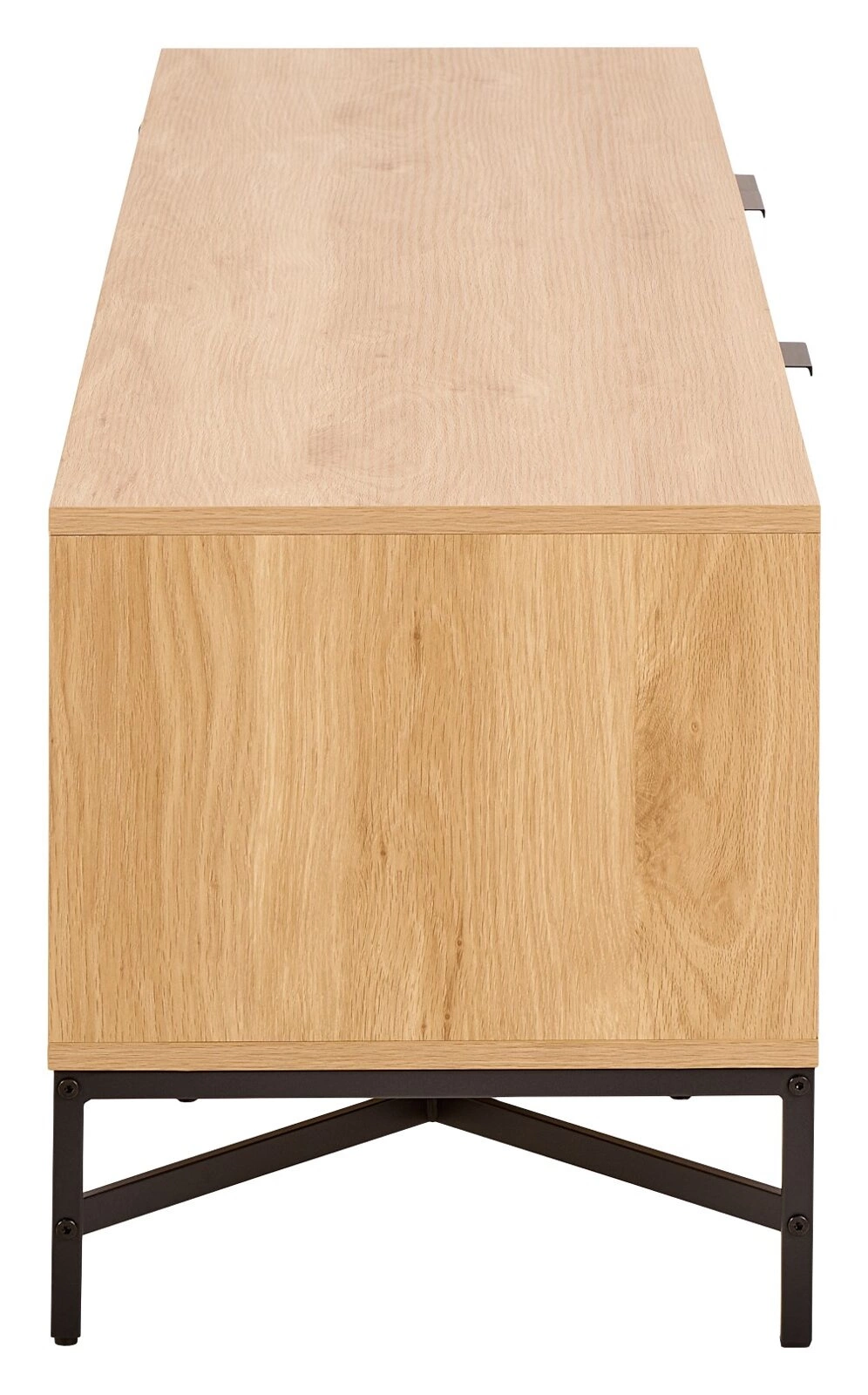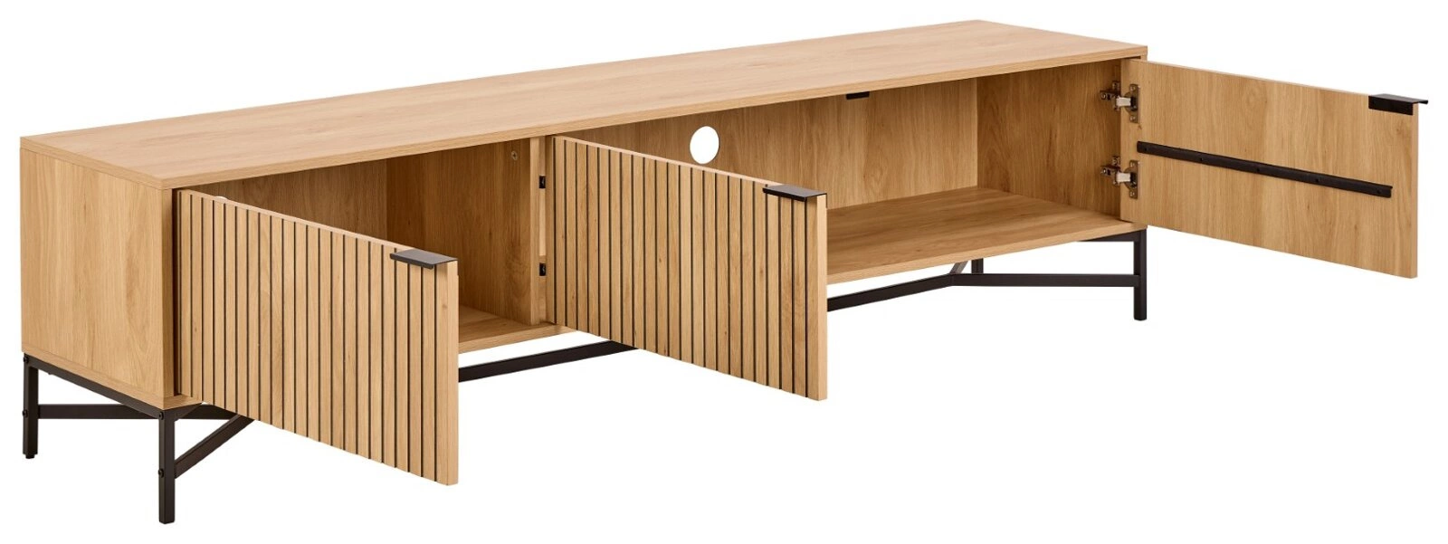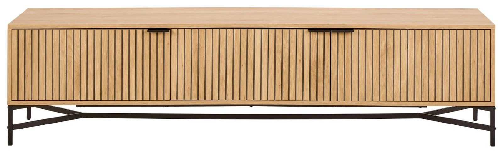 TV skříňka Jaipur dub černá 180 cm skvěle zapadá do trendů moderních interiérů. Ryhovaný čelní panel v odstínu dubu dodává nábytku hloubku a jedinečný charakter, zatímco minimalistický tvar zajišťuje univerzální využití v současných domácnostech. Díky černým kovovým nohám působí skříňka lehce a elegantně, aniž by ztrácela na stabilitě. Je to ideální volba pro ty, kteří hledají moderní TV skříňku, která vyniká svým vzhledem i praktičností.