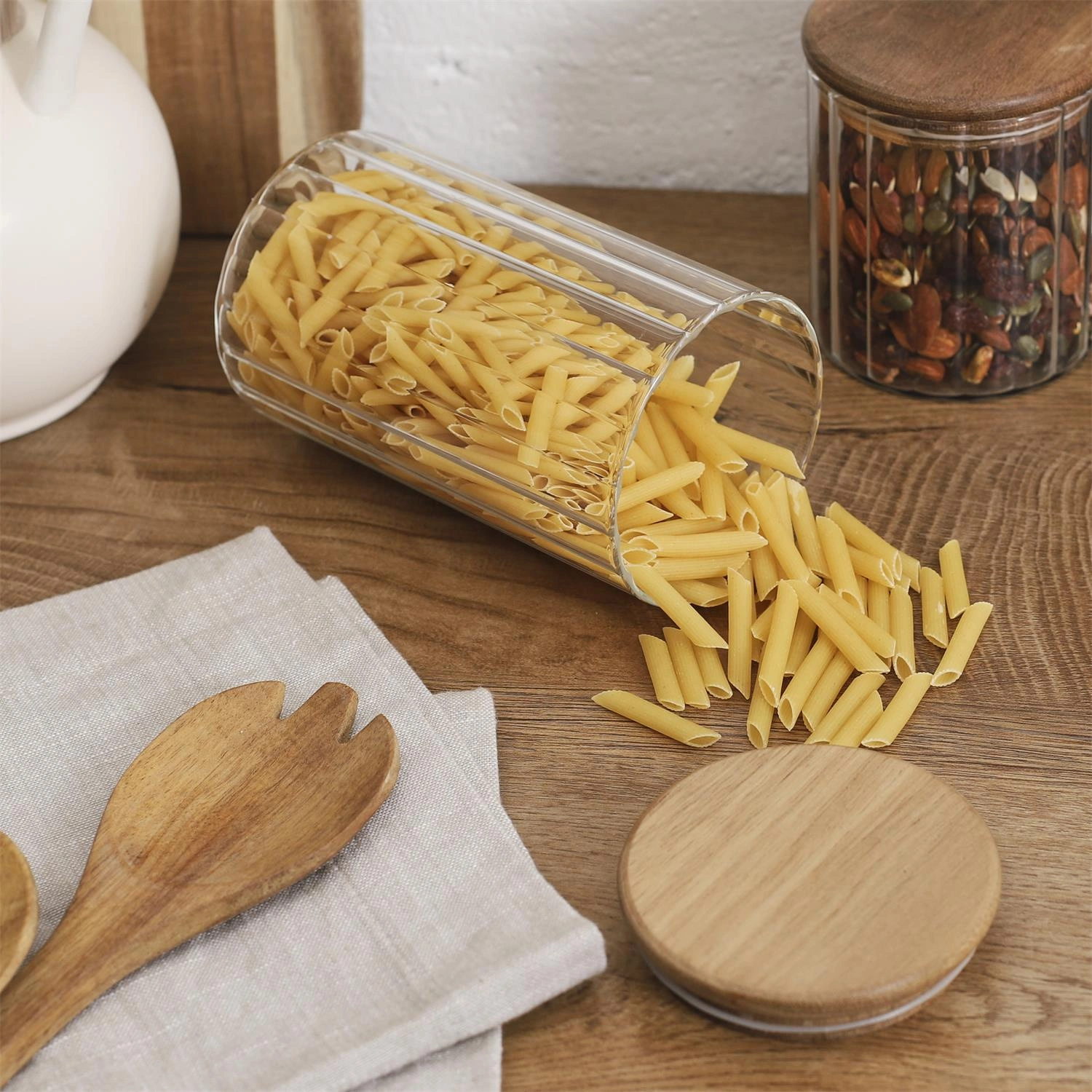 Představená pruhovaná úložná nádoba je elegantním a funkčním řešením do každé kuchyně. Je vyrobena z vysoce kvalitního skla a svým charakteristickým rýhovaným tvarem vnese do vašeho interiéru jedinečnou atmosféru. Dřevěné víko vyrobené z robustního akáciového dřeva dodává sklenici přirozený půvab a zároveň zajišťuje její trvanlivost a spolehlivé používání. S objemem 700 ml je sklenice ideální pro uchovávání všech druhů potravin, od koření až po domácí zavařeniny.