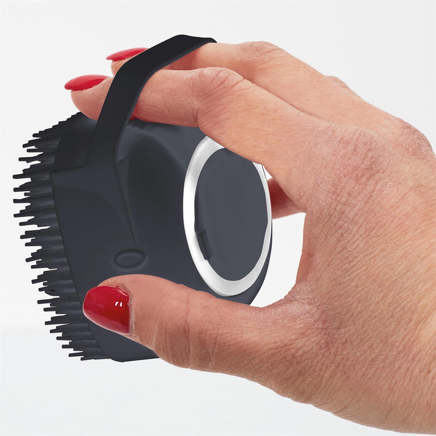 Produkt je vyroben z kvalitního silikonu v univerzální šedé barvě, která se skvěle hodí k většině současných kuchyňských interiérů. Silikonový povrch usnadňuje udržování kartáče v čistotě – stačí rychle opláchnout pod tekoucí vodou a zbavit se zbytků detergentu či mastnoty. Čtvercový tvar zajišťuje, že kartáč s dávkovačem na prostředek stabilně stojí na dřezu a nezabírá zbytečně místo.