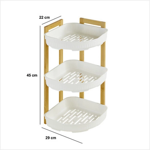 Rohová koupelnová police Naturéo 3patrová bílá od značky 5five simply smart je praktickým a stylovým řešením do každé koupelny. Je vyrobena z kombinace odolného plastu a přírodního bambusu, což zajišťuje nejen stabilitu, ale i výjimečný vzhled inspirovaný skandinávským stylem. Díky třem policím a kompaktním rozměrům (výška 45 cm, šířka 22 cm, hloubka 29 cm) tato rohová koupelnová police umožňuje efektivně využít i malý kout místnosti.