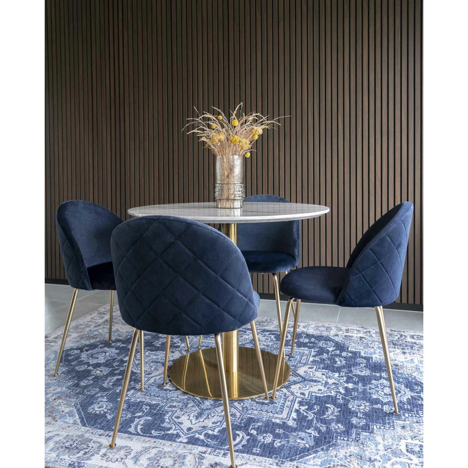 Čalouněná židle Geneve Intesi je esencí glamour stylu v moderním provedení. Měkký, sametový sedák v hlubokém námořnickém odstínu a štíhlé, zlaté ocelové nohy vytvářejí jedinečnou kombinaci, která promění každou jídelnu, obývací pokoj nebo kuchyni. Ergonomický tvar a výplň z vysoce kvalitní čalounické pěny zajišťují pohodlí i při delším posezení u stolu.