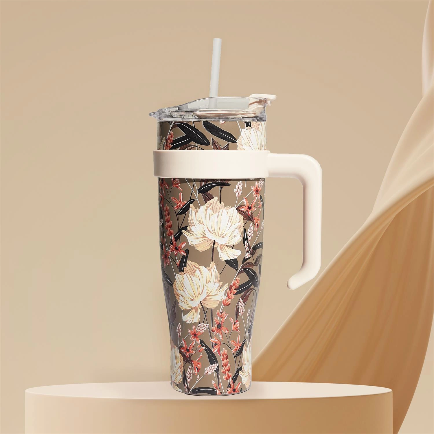 Jedinečný béžový termohrnek Fleur s uchem o objemu 1,2 l je kombinací stylu a praktičnosti. Jeho okouzlující květinový design z něj činí nejen praktický nástroj, ale také elegantní doplněk každé kuchyně. Robustní konstrukce z nerezové oceli a plastu zaručuje vynikající tepelně izolační vlastnosti. Díky pohodlnému držadlu a velkému objemu je hrnek ideální pro každodenní pití kávy doma i na dlouhé cesty autem.