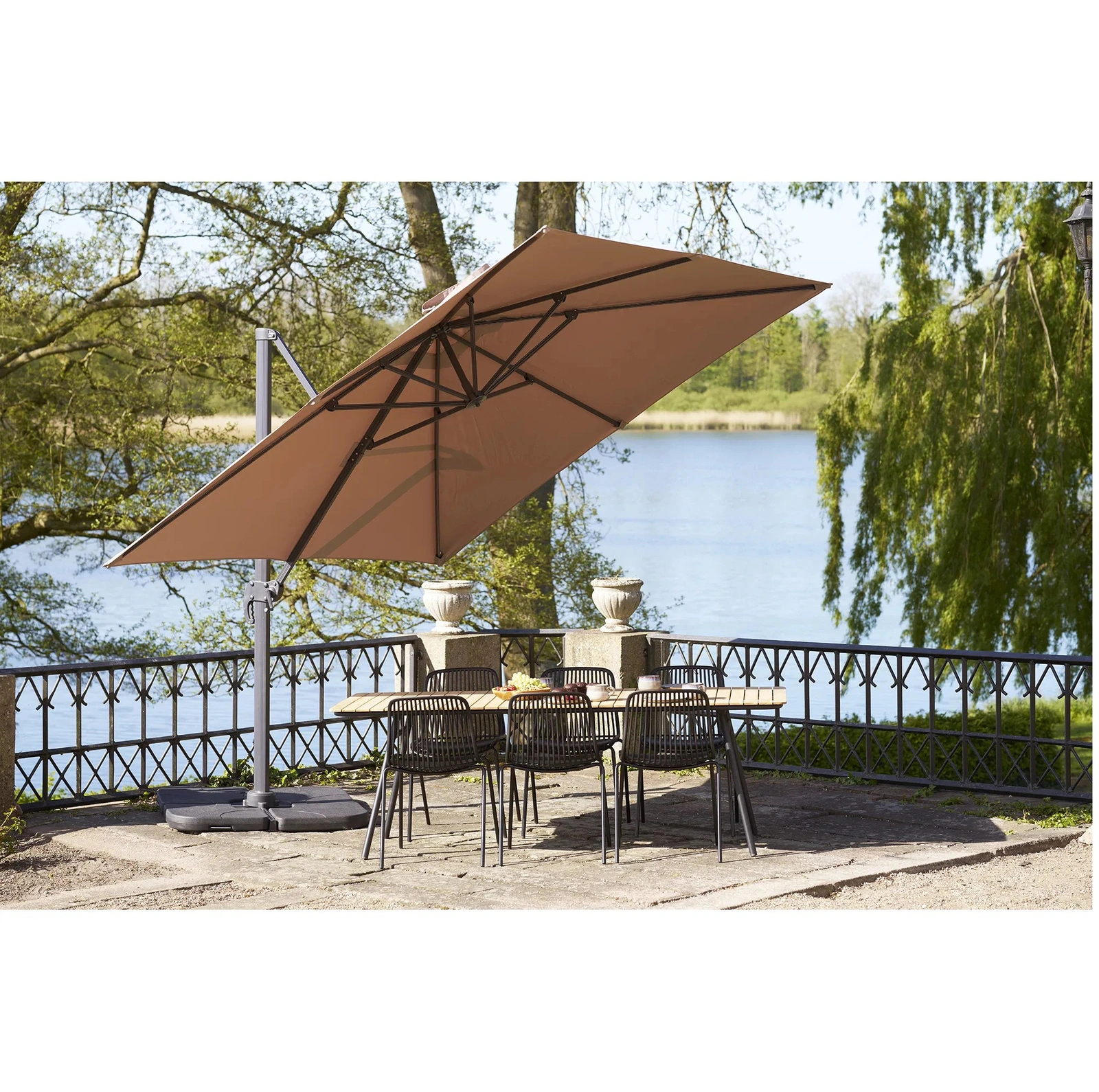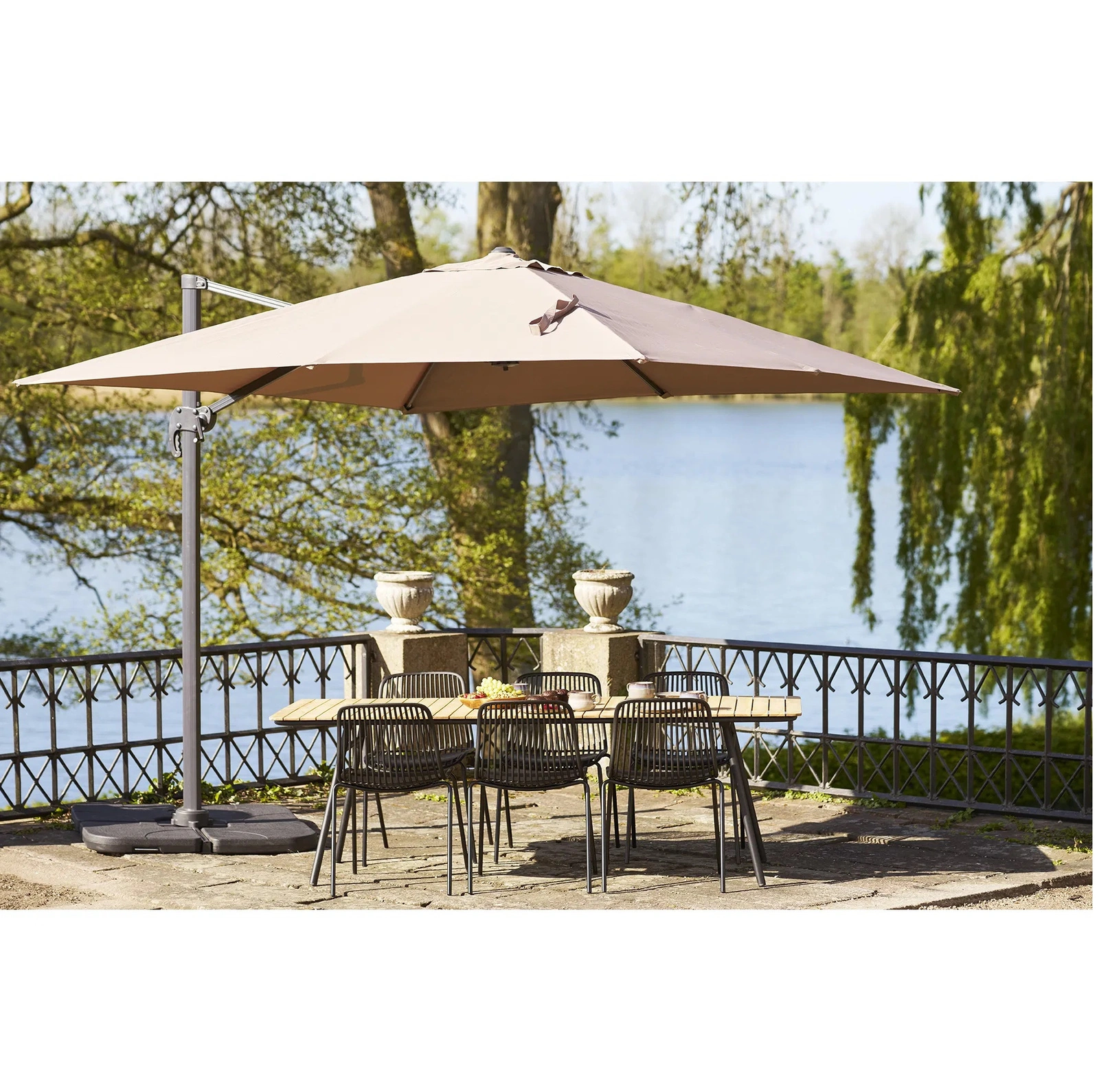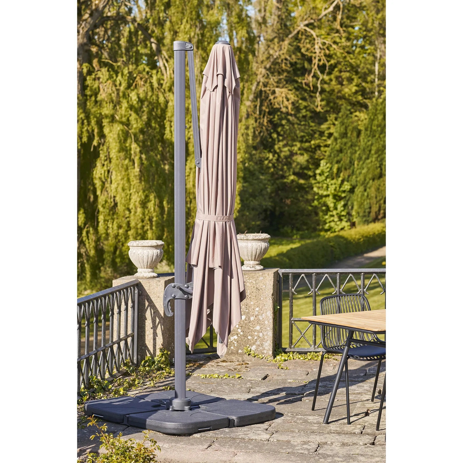 Velká, cca 295cm stříška zahradního slunečníku Baza poskytuje rozsáhlý stín pro jídelní stůl, odpočinkovou soupravu nebo lehátka. Písková látka působí vzdušně a nezahřívá se tolik jako tmavé barvy, což zvyšuje komfort pobytu venku i na ostrém slunci. Minimalistický tvar a černé konstrukční prvky zajišťují, že se slunečník skvěle hodí na moderní terasy a balkony.