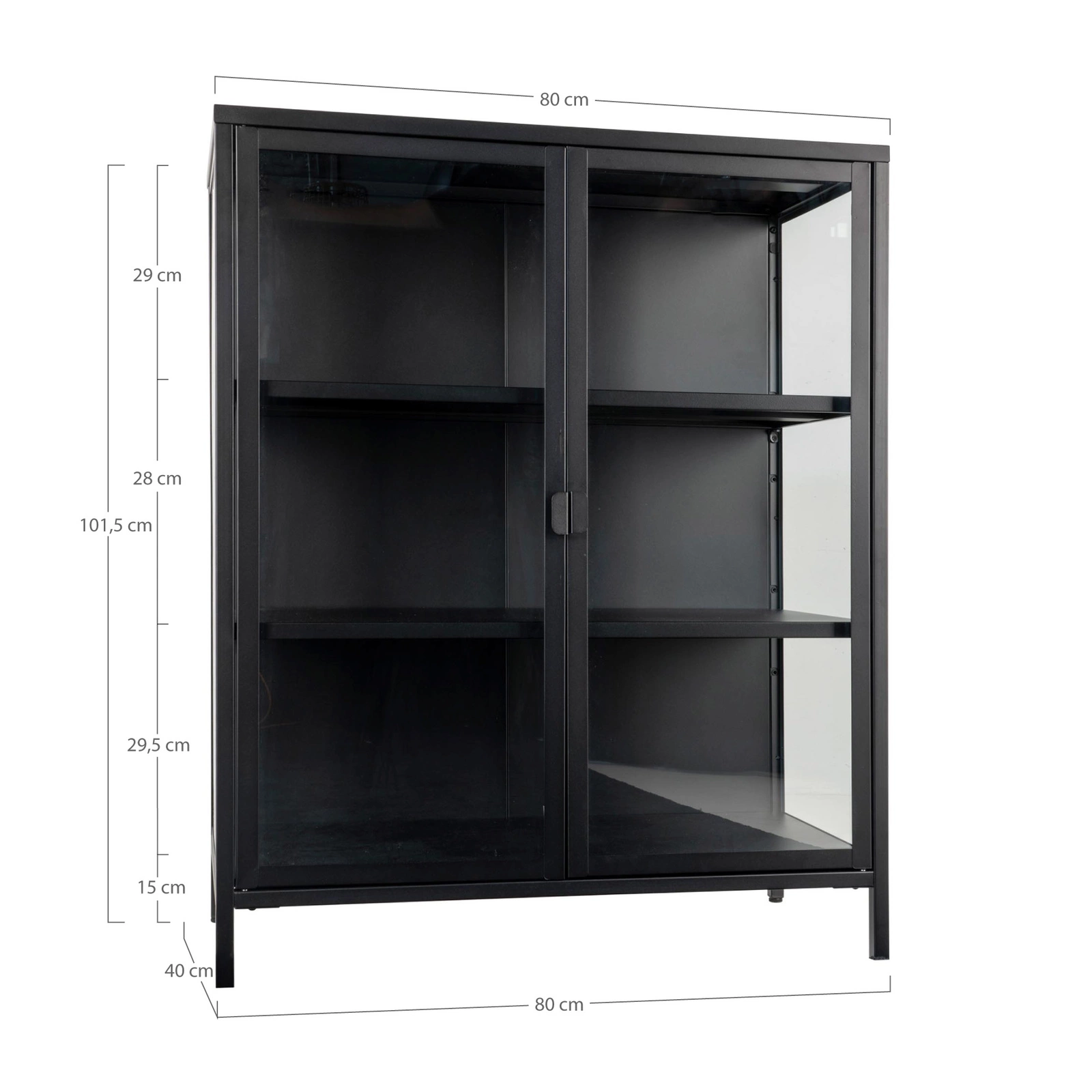 Kovový rám a skleněné dvířka jsou kombinací, která nejen skvěle vypadá, ale je také velmi praktická. Díky pevné konstrukci se vitrína Brisbane vyznačuje vysokou odolností vůči každodennímu používání a její černý polomatný povrch neulpívá na otiscích prstů. Rozměry 101 × 80 × 40 cm umožňují umístění nábytku i do menších místností bez kompromisu na úložném prostoru.