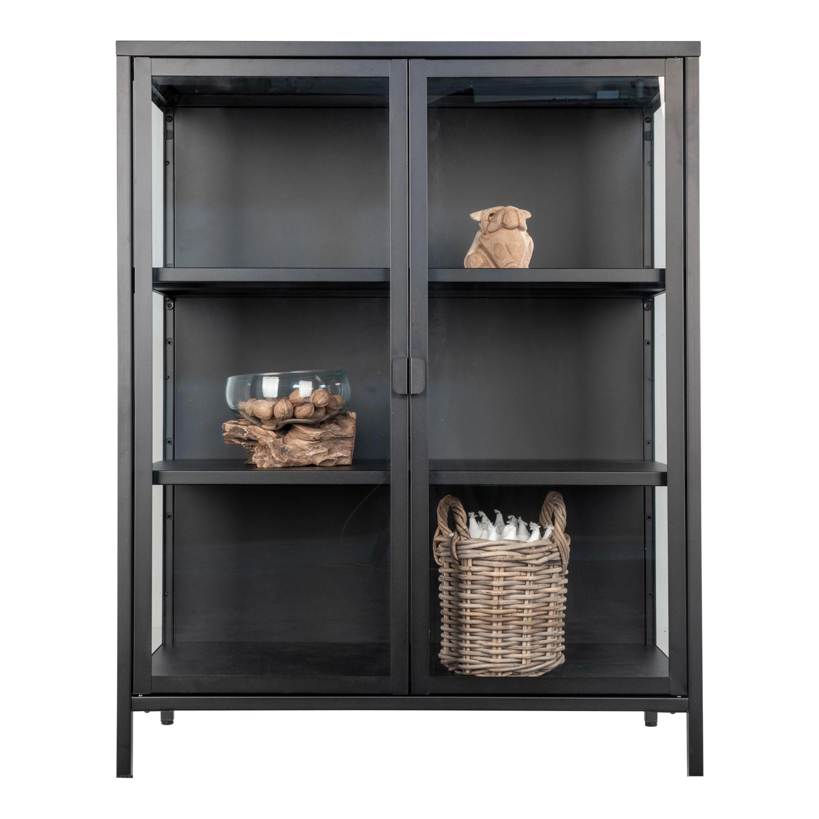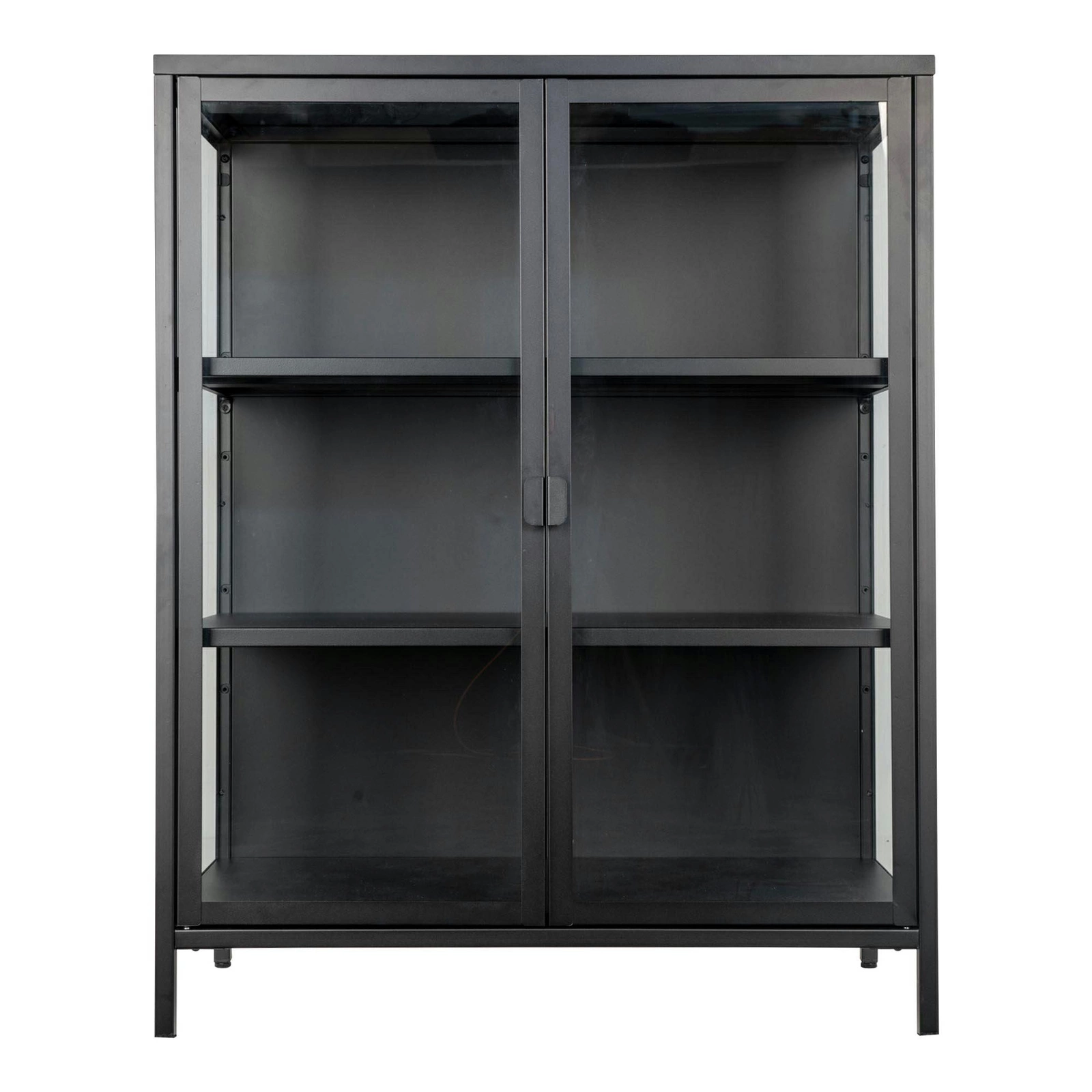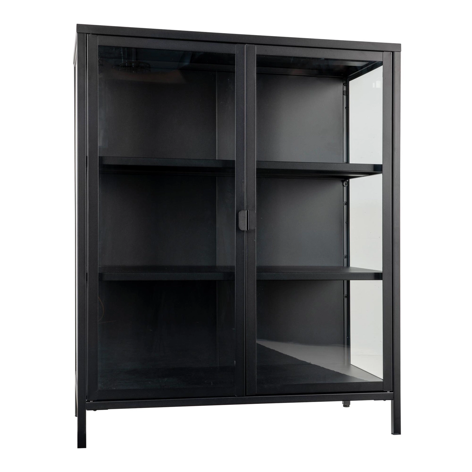 Skleněná vitrína na knihy a alkohol Brisbane od značky Intesi je moderní loftový nábytek, který spojuje odolnost kovu s elegancí skla. Nabízí šest praktických polic za dvěma hladkými dvířky, při šířce 80 cm a výšce 101 cm. Černý polomatný povrch a minimalistická forma podtrhují charakter obývacího pokoje, domácí pracovny nebo stylové jídelny.