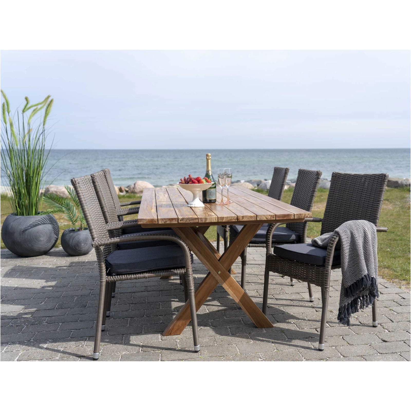 Stůl Murcia je vyroben z teakového dřeva, které je ceněné pro svou mimořádnou odolnost vůči vlhkosti, poškrábání a každodennímu používání. Olejovaná povrchová úprava chrání desku, usnadňuje údržbu a podtrhuje sytý, přírodní odstín dřeva. Pevná konstrukce na čtyřech masivních nohách zajišťuje stabilitu i při maximálním zatížení až 50 kg – ideální volba do rušných domácností i komerčních prostor.