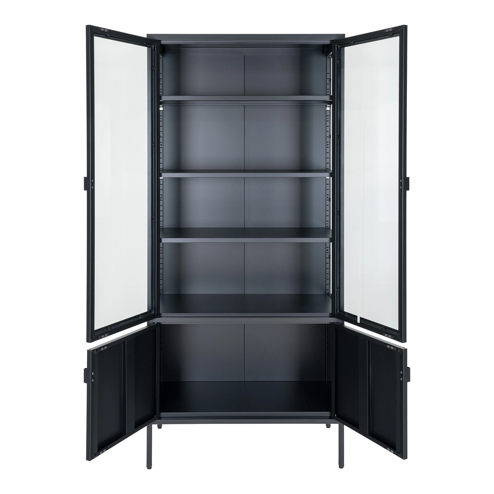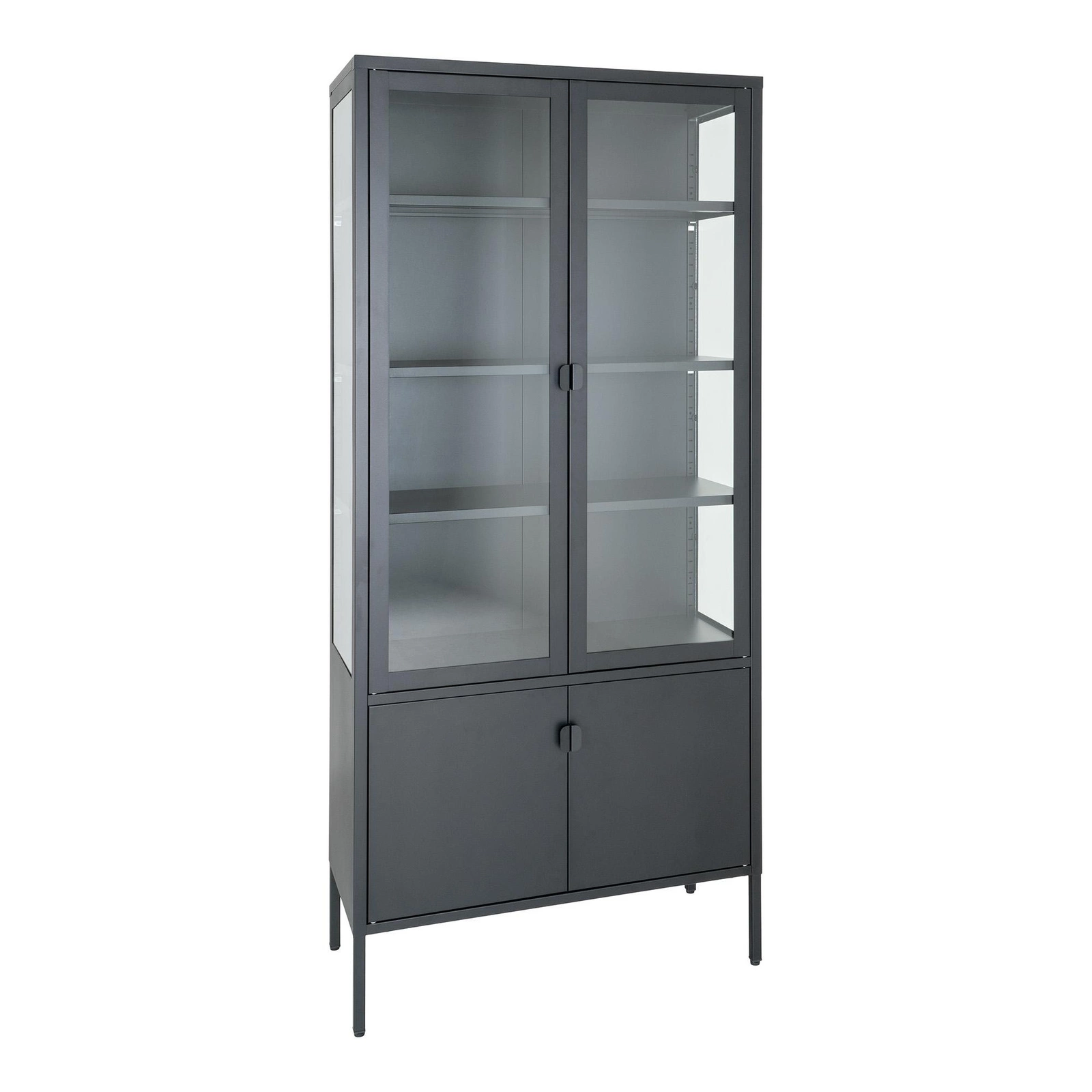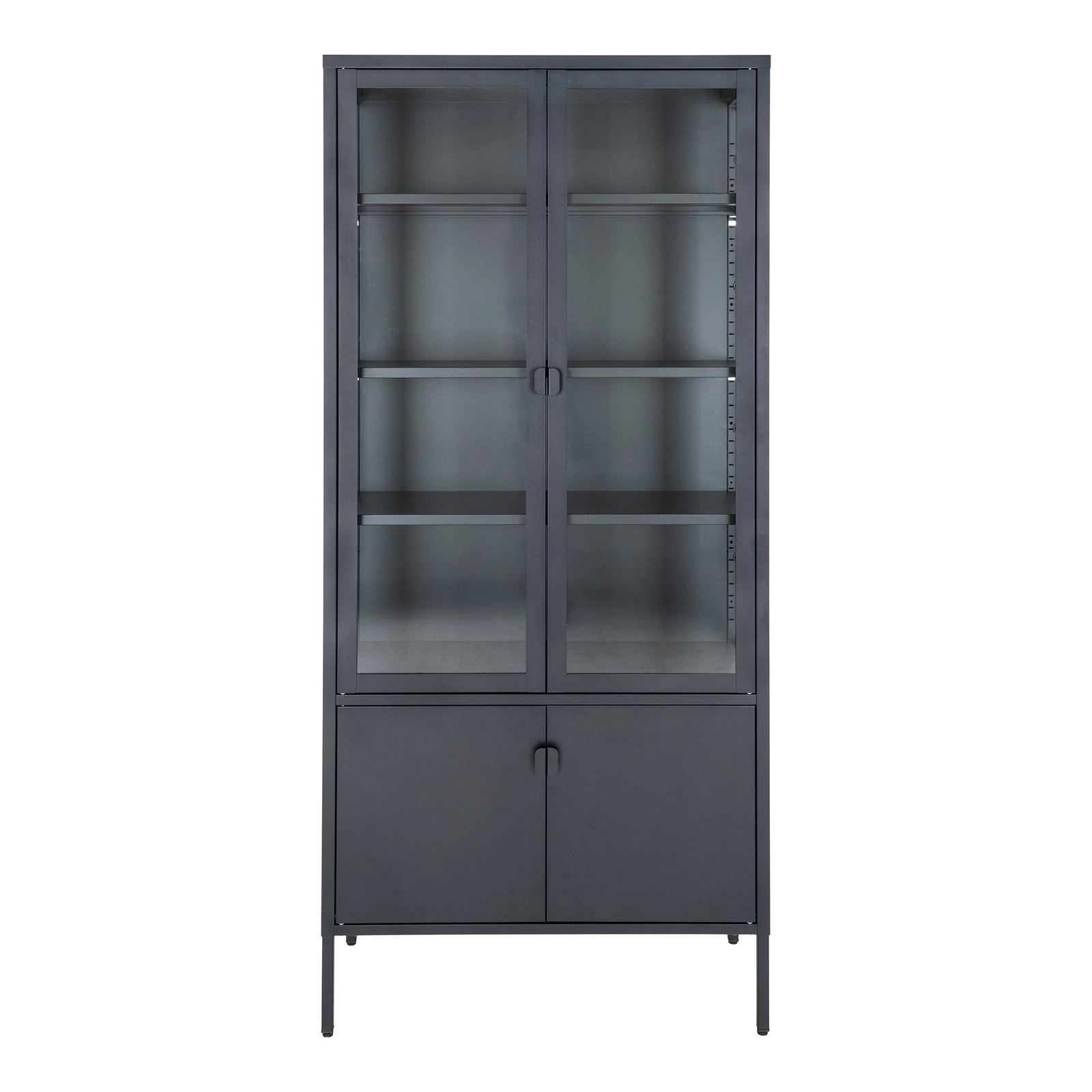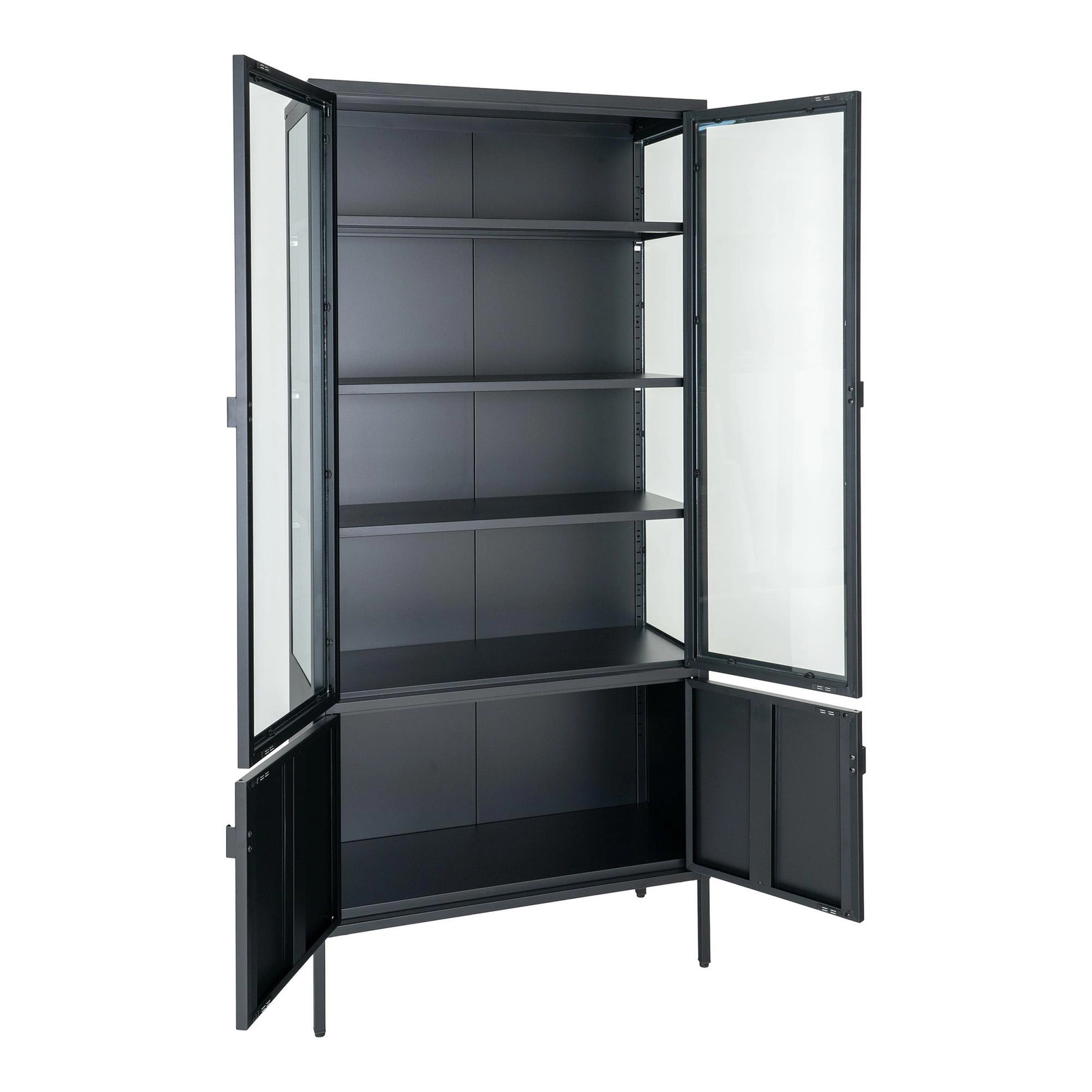 Černý kovový regál Brisbane se skleněnými dveřmi je esencí loftového stylu – surová ocel, jednoduché linie a prosklené dveře zdůrazní moderní vzhled vašeho interiéru. Matný povrch dodává eleganci a čtyři stabilní nohy zajišťují bezpečné používání i při větším zatížení. Industriální knihovna se skvěle hodí do minimalistických nebo moderních eklektických prostor, kde se stává nejen funkčním, ale i dekorativním prvkem vybavení.