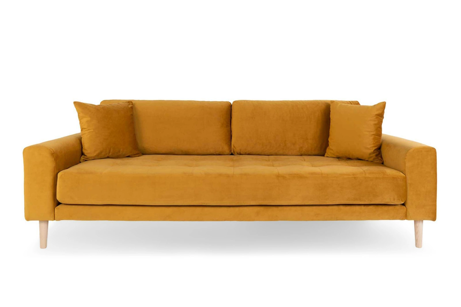 Trojmístná pohovka Lido od značky Intesi je skandinávským prvkem, který oživí každý interiér. Čalounění z měkké, sametové látky v sytě žlutém odstínu zaujme jemným leskem a hloubkou barvy. Stabilitu zaručují pevné, přírodní dřevěné nohy, zatímco kompaktní rozměry – šířka 210 cm a hloubka 65 cm – umožní pohovce skvěle zapadnout do obývacího pokoje, studentského pokoje nebo stylové čekárny. Ergonomické područky a pohodlná výplň z čalounické pěny zajistí komfort při každodenním odpočinku i během setkání s rodinou či přáteli.