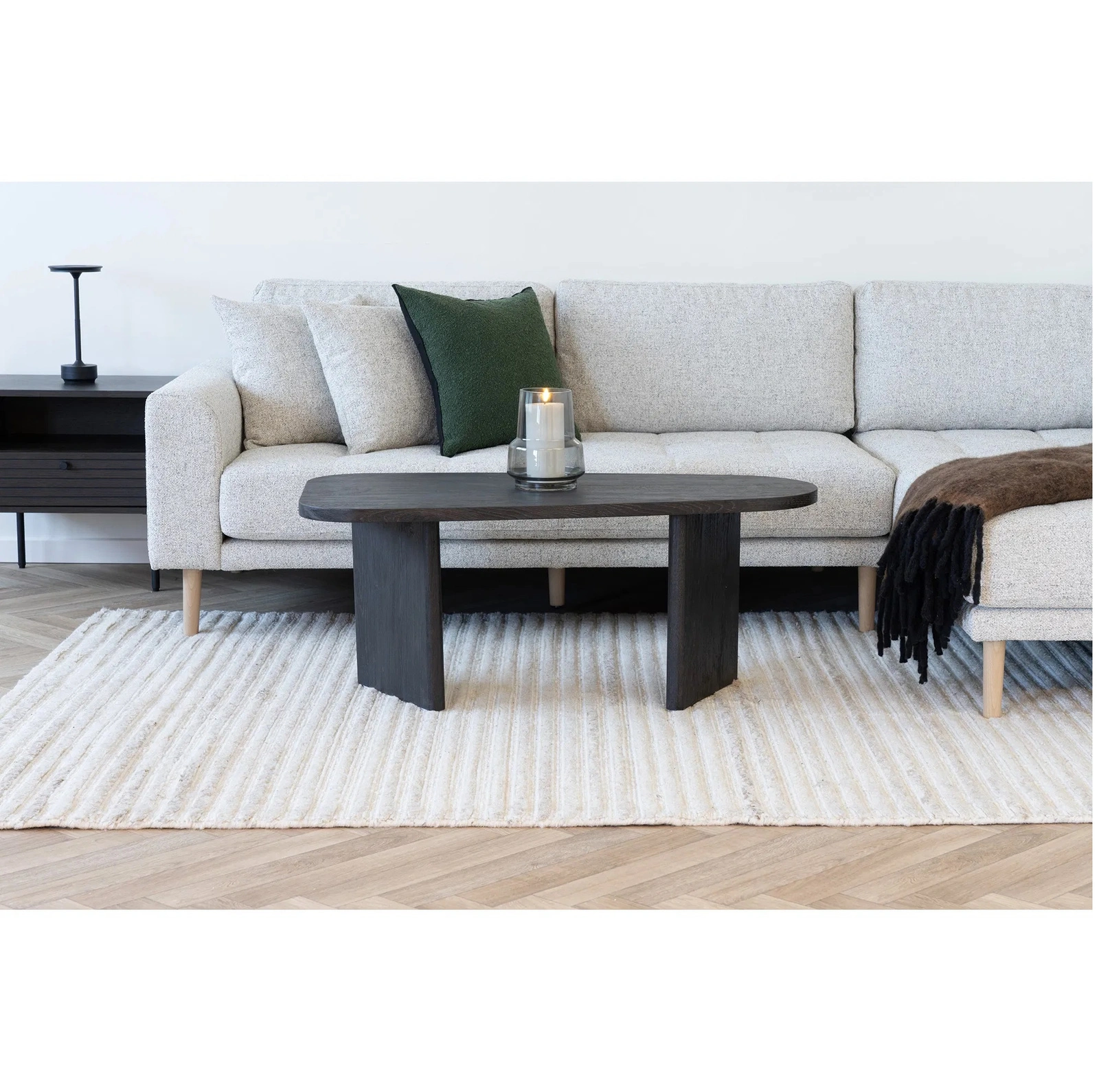 - Oválná deska 50×100 cm – poskytuje dostatek prostoru na kávu i dekorace, aniž by opticky zatížila i menší obývák.