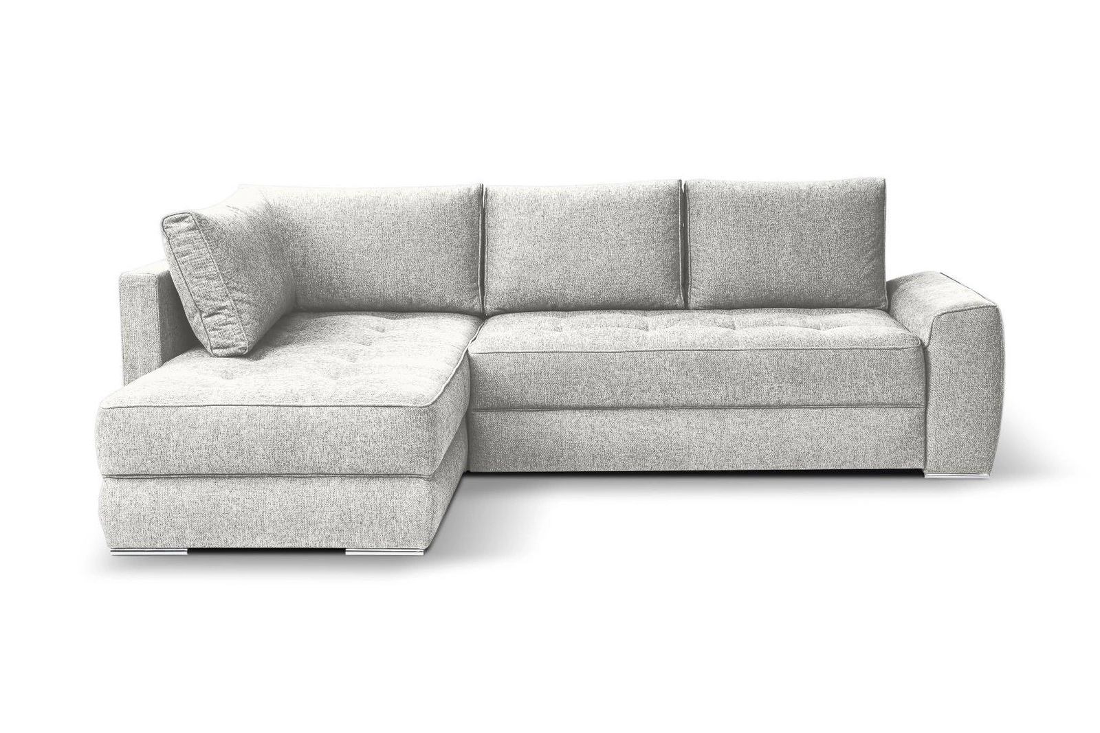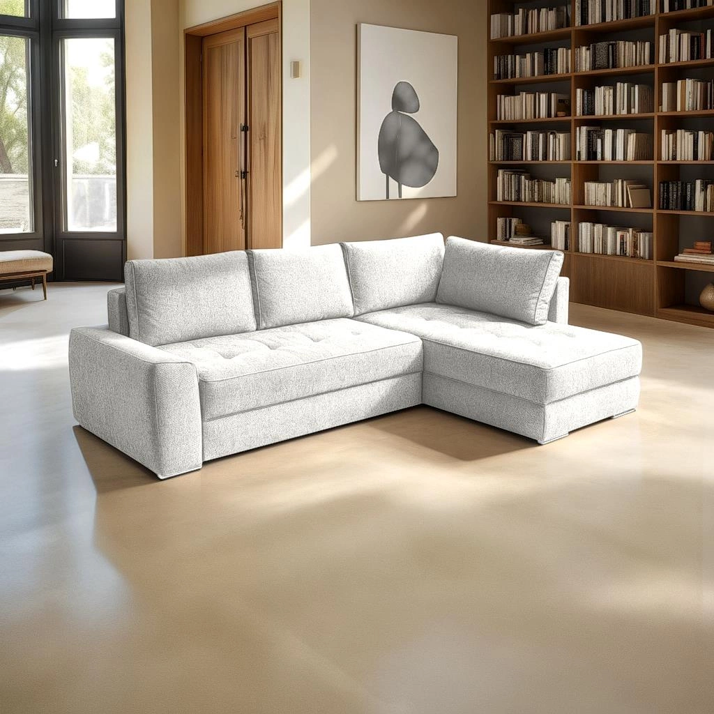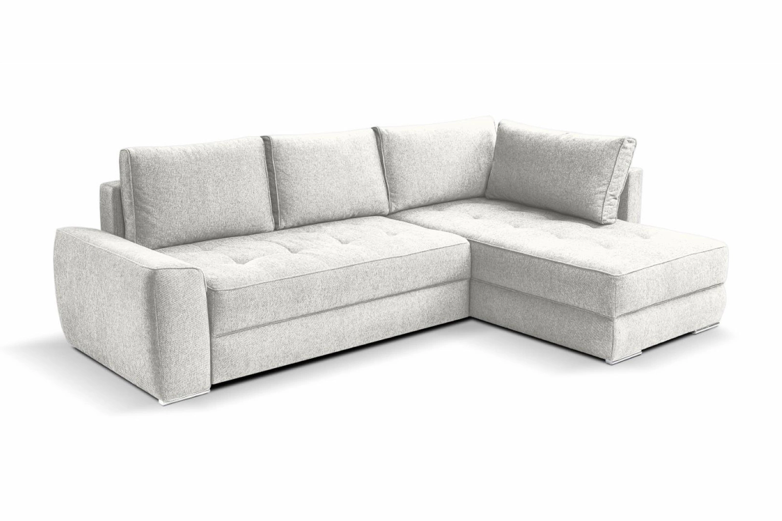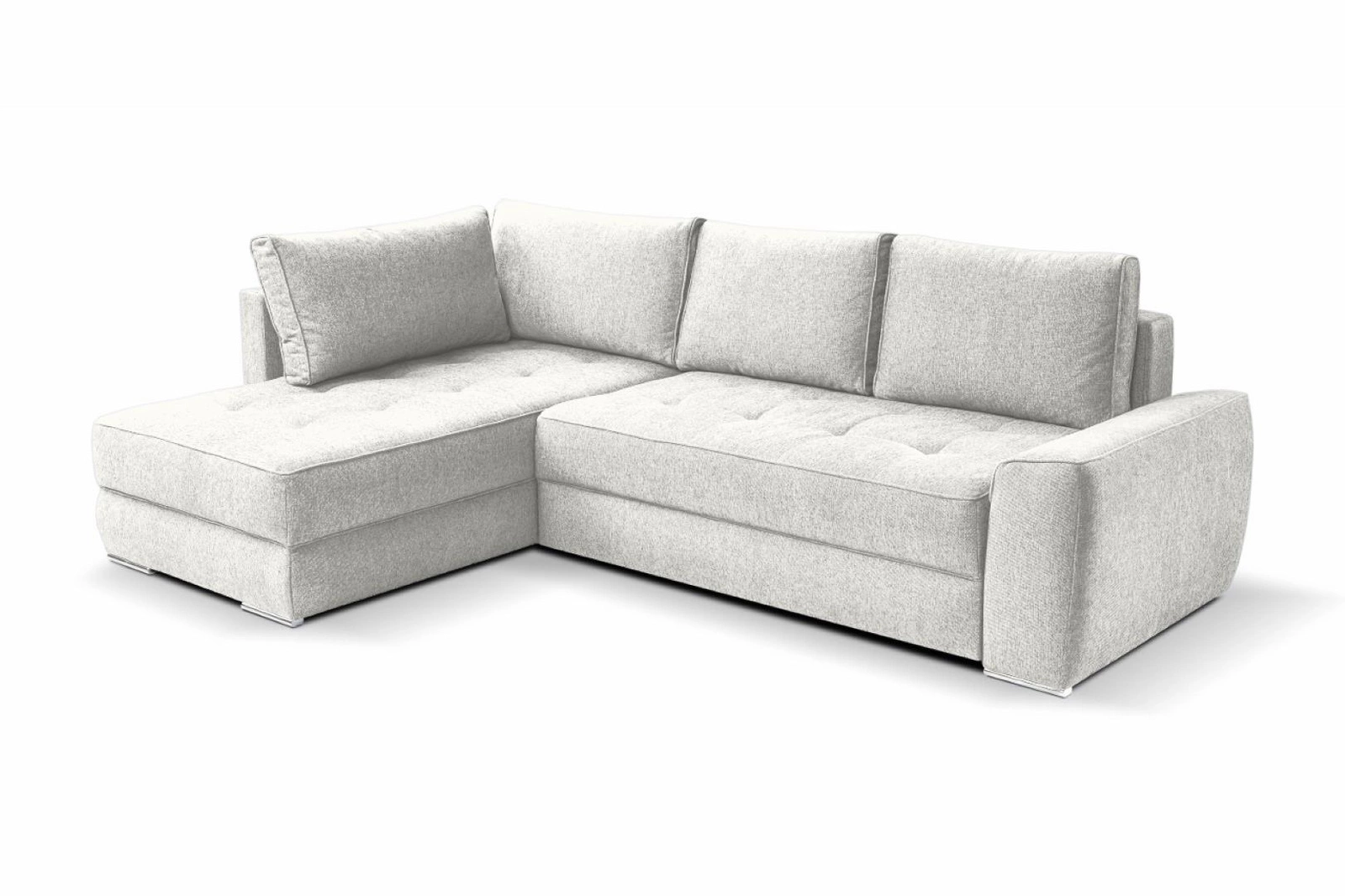 Rohová sedačka s rozkládací funkcí do obývacího pokoje Rabis od značky Intesi je moderní odpočinkový nábytek v bílé barvě, který spojuje univerzální design s maximální funkčností. Model o rozměrech 266×185 cm nabízí velkou spací plochu 130×226 cm a praktický úložný prostor na lůžkoviny, takže je ideální jak jako pohodlný rohový gauč pro každodenní relaxaci, tak i jako prostorná postel na každodenní spaní. Vysoké, stabilní sedadlo s výplní z čalounické pěny a pružin zajišťuje optimální komfort, zatímco univerzální oboustranné provedení umožňuje snadné přizpůsobení sedačky každému obýváku.