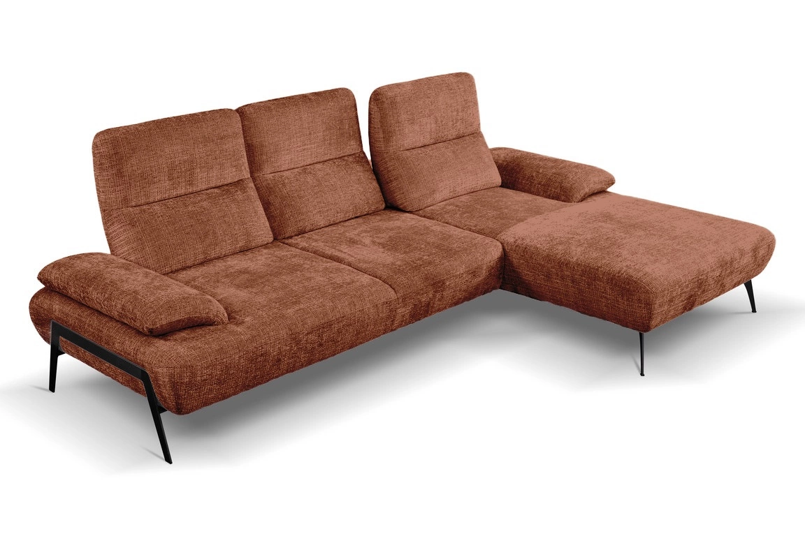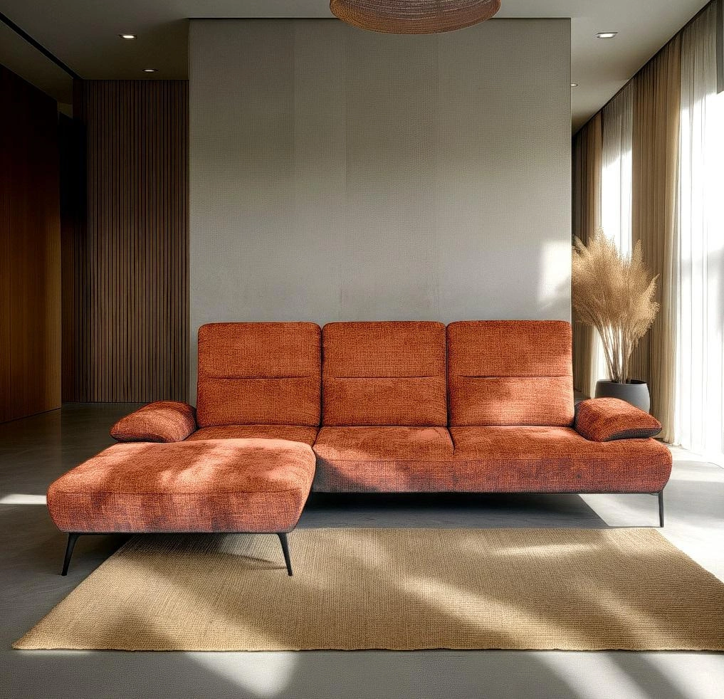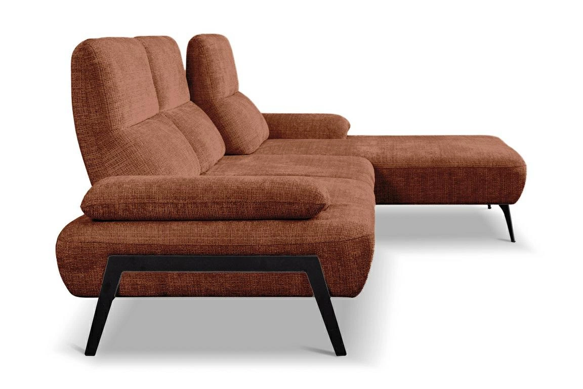 Moderní rohová sedačka do obývacího pokoje Rasmus terrakota pravá od značky Intesi je výrazný a pohodlný odpočinkový nábytek o šířce 290 cm a hloubce 185 cm, jehož hlavní předností je nastavitelné opěradlo. Vyniká mimořádně příjemnou látkou v teplém odstínu terrakoty a robustní kovovou podstavou v kontrastní černé barvě. Navržena pro moderní interiéry, zajišťuje každodenní pohodlí a vytváří útulnou atmosféru v každém obýváku.