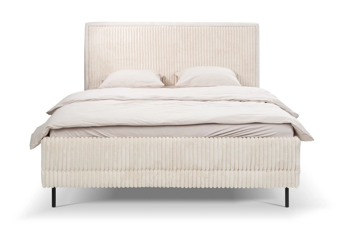 Foggy 140x200 je čalouněná postel, která dokonale spojuje minimalistický design s útulností manšestrové látky. Jemná béžová barva a sametově hebké provedení vnášejí do interiéru lehkost, zatímco černé kovové nohy podtrhují moderní charakter nábytku. Tento model se skvěle hodí jak do světlých, prostorných ložnic, tak do menších a útulných prostor, kde zvýrazní skandinávskou atmosféru domova.