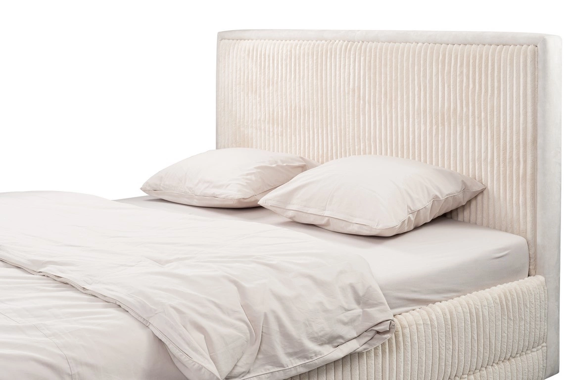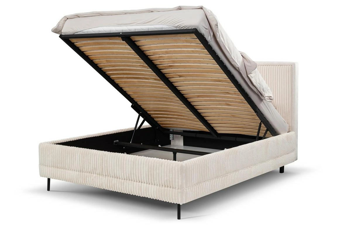 Postel Foggy 180x200 béžová je moderní čalouněná postel, která skvěle doplní každou ložnici. Vyniká vysokým, měkce polstrovaným čelem, praktickým úložným prostorem na lůžkoviny a elegantní manšestrovou látkou v jemném, univerzálním béžovém odstínu. Stabilní kovová základna a pohodlný rošt v ceně zaručují pohodlí každou noc.