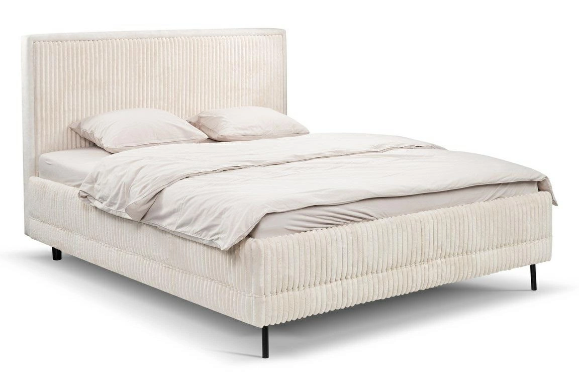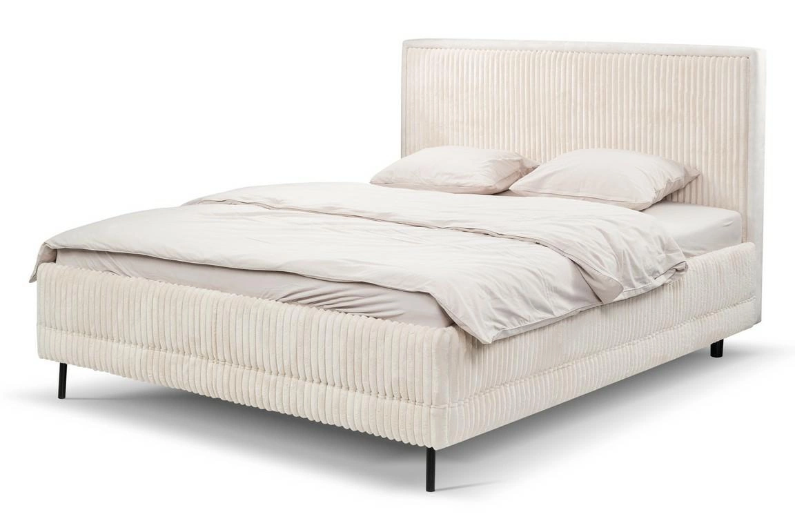Béžová čalouněná postel Foggy je potažena sametově měkkou manšestrovou látkou, která nejen zaujme na pohled, ale také se snadno udržuje v čistotě. Jednoduché, geometrické linie a černé, štíhlé nohy dodávají posteli lehkost a perfektně zapadají do oblíbeného moderního stylu. Kovová konstrukce zajišťuje stabilitu a pevná konstrukce z odolných desek garantuje, že si postel zachová skvělý vzhled po mnoho let používání.
