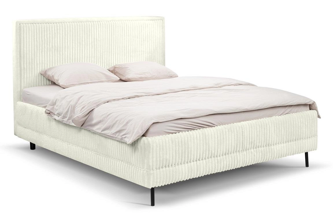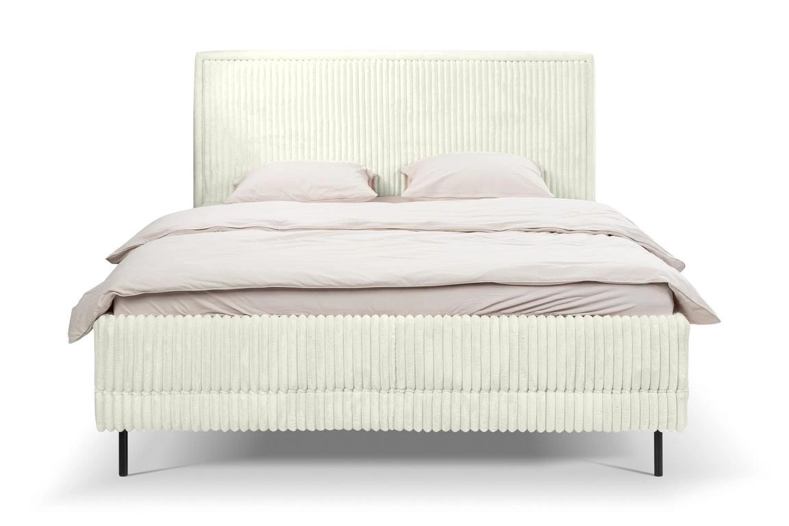 Minimalistický tvar postele Foggy perfektně zapadá do aktuálních trendů moderních ložnic. Typické jemně zaoblené linie a elegantní manšestr dodají interiéru útulnost. Vysoké, čalouněné čelo o výšce 120 cm nejen krásně vypadá, ale také poskytuje pohodlnou oporu při večerním čtení nebo odpočinku. Celá konstrukce stojí na štíhlých černých kovových nohách, které opticky odlehčují postel a usnadňují úklid pod nábytkem.