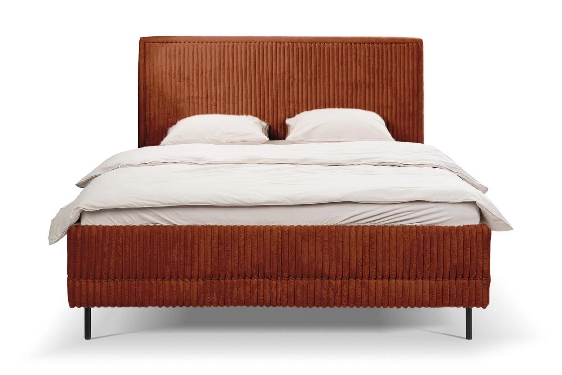 Výrazné čalounění v barvě terakoty dodává posteli Foggy jedinečný charakter a skvěle zapadá do aktuálních trendů v bydlení. Měkké, obdélníkové čelo nejen zdobí, ale také poskytuje pohodlnou oporu při večerním čtení nebo práci na notebooku. Moderní, vzdušný tvar a černé kovové nohy podtrhují současný styl, díky čemuž je Foggy ozdobou každé ložnice.