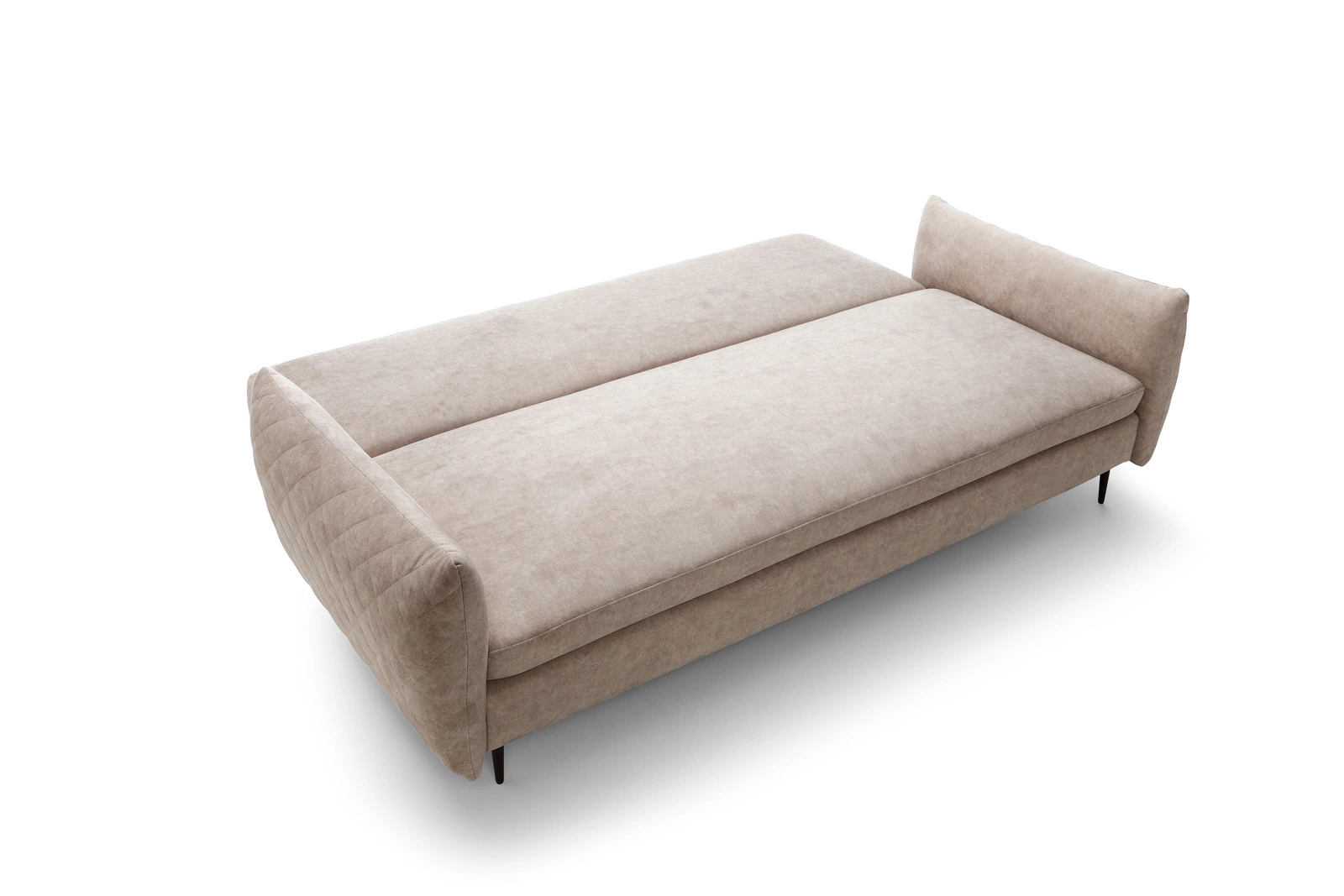 Inspirace skandinávským stylem je patrná v jednoduchých, geometrických liniích a tlumené béžové barvě. Vysoké černé kovové nohy dodávají pohovce lehkost a umožňují snadné udržení čistoty pod nábytkem – ocení to zejména ti, kdo dbají na pořádek nebo trpí alergiemi. Jemné područky a ergonomická výška sedáku (44 cm) zajišťují pohodlí při večerním odpočinku i při delším posezení s přáteli.