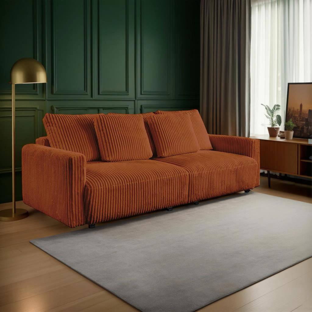 Rozkládací pohovka s funkcí spaní Loppie manšestrová terakota do obýváku moderní