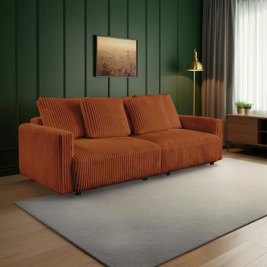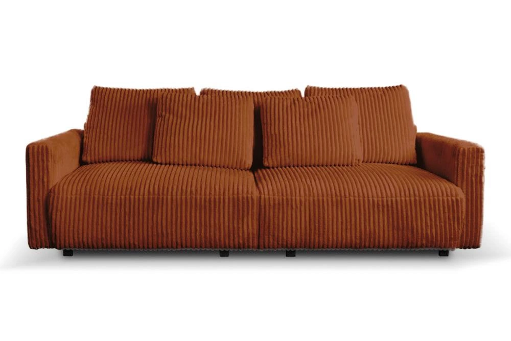 Pohovka Loppie je víc než jen kus nábytku – je to srdce domácího odpočinku, které spojuje pohodlí, styl a praktičnost. Díky manšestrovému čalounění v trendy terakotové barvě a funkci spaní je perfektní jako hlavní pohovka do obývacího pokoje i jako pohodlná postel pro hosty. Její proporce a moderní design ji předurčují jak do větších, tak středně velkých prostor, kterým dodá jedinečný styl a útulnou atmosféru.