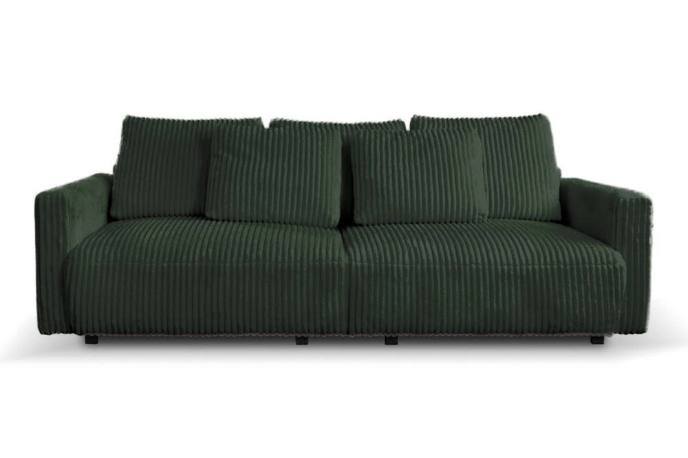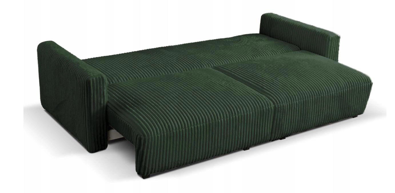 Zelená rozkládací pohovka Loppie nabízí nejen funkčnost, ale také výrazný styl, který promění vzhled každého moderního interiéru. Charakteristická manšestrová látka v hlubokém zeleném tónu přitahuje pozornost a vnáší do obývacího pokoje svěžest i eleganci. Jednoduché linie, vysoké opěradlo (94 cm) a široké, pohodlné sedadlo tvoří harmonický celek, který skvěle zapadne do minimalistického nebo skandinávského stylu zařízení.