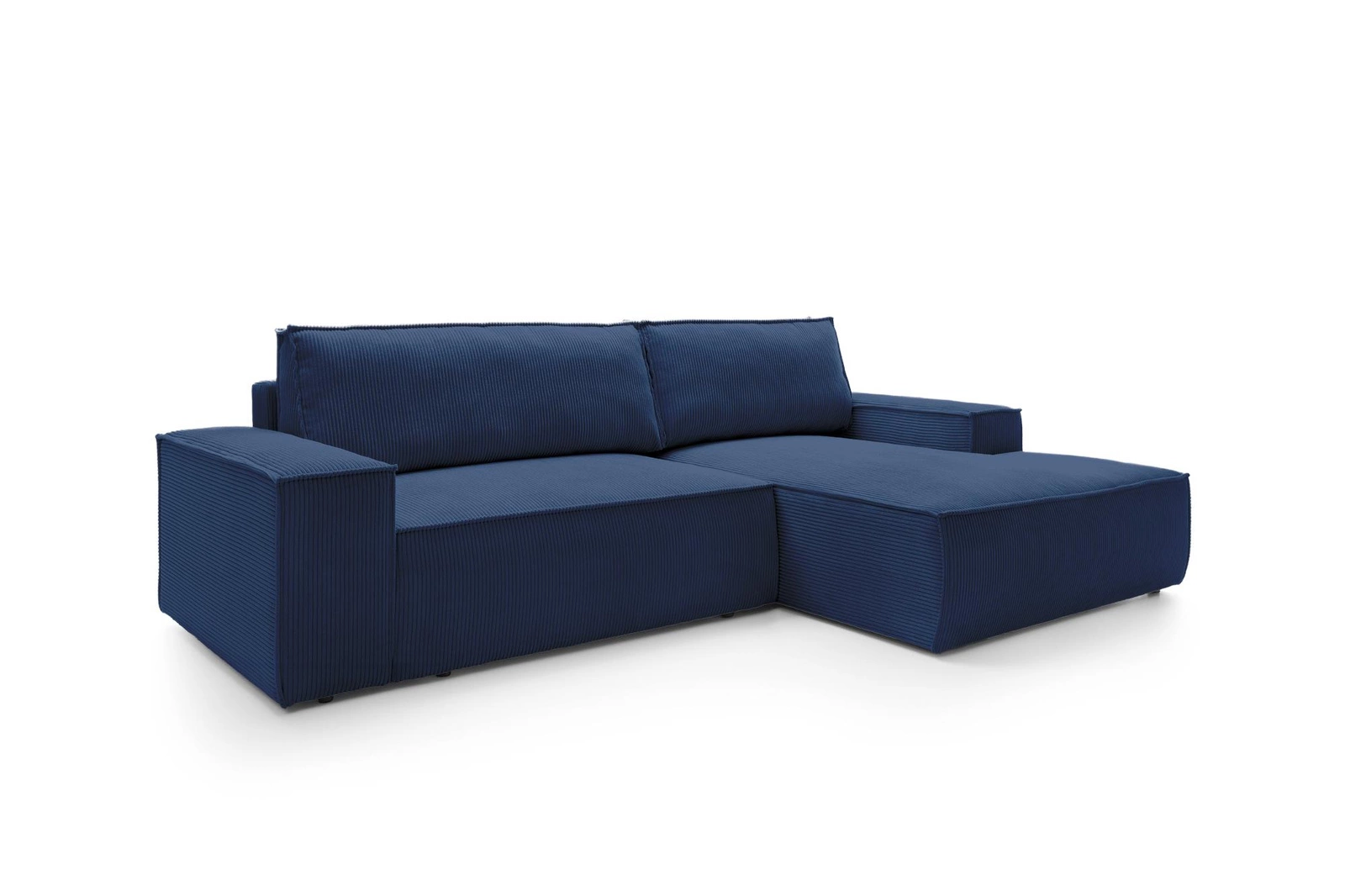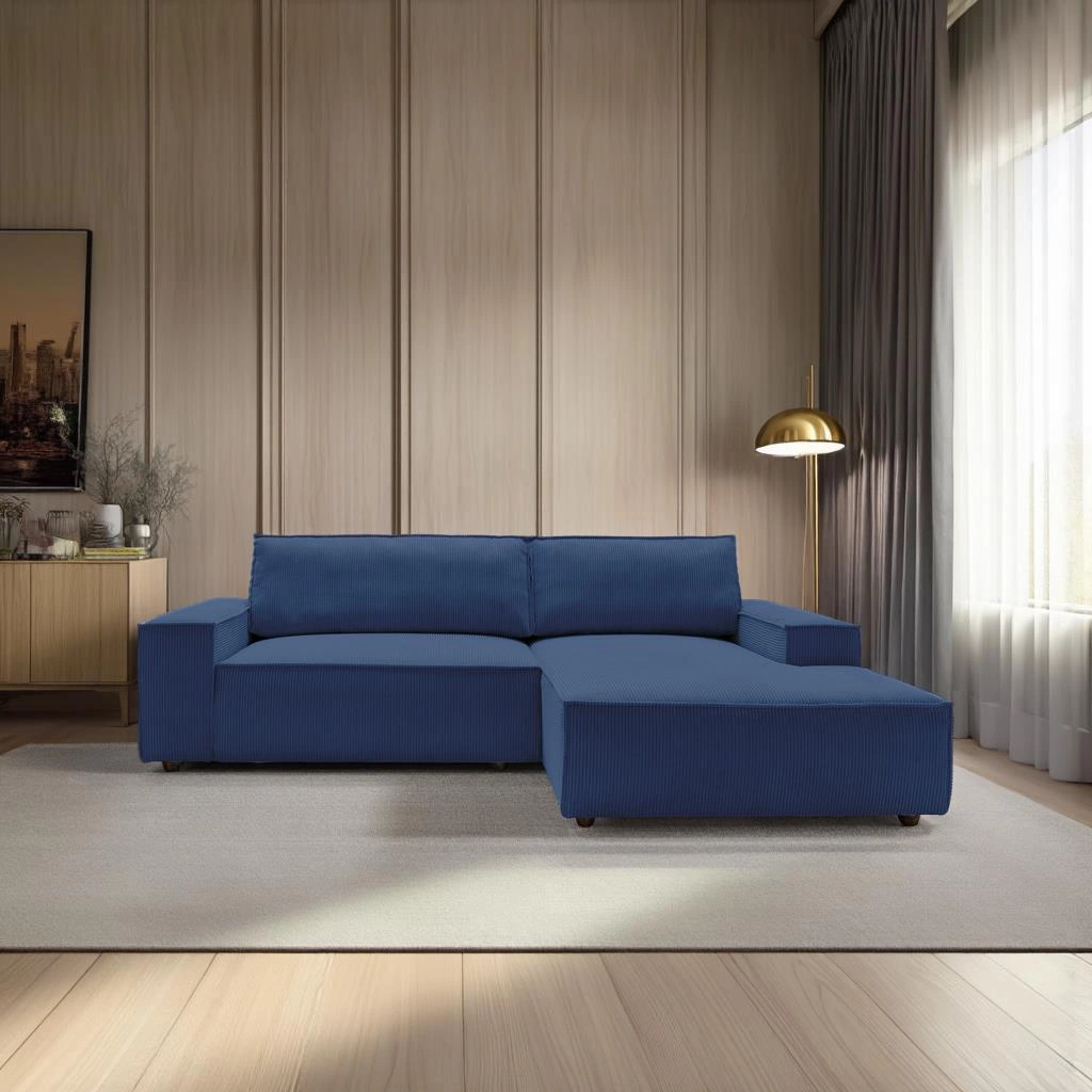 Rohová sedačka s rozkládací funkcí Molde M pravá od značky Intesi je moderní odpočinkový nábytek, který spojuje pohodlí, praktičnost a výrazný styl. Je vyrobena z příjemné, na dotek měkké manšestrové látky v hlubokém odstínu modré, nabízí velkou plochu na sezení (267 × 167/195 cm) a pohodlné místo na každodenní spaní o rozměrech 210 × 135 cm. Praktický úložný prostor na lůžkoviny a široké područky dělají z této rohové sedačky ideální volbu do obývacího pokoje pro ty, kteří si cení funkčnosti a designu.