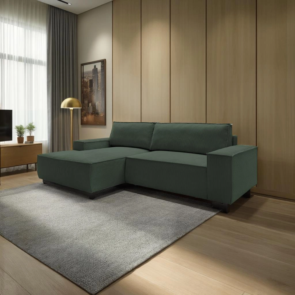 Rohová sedačka Molde M levá zelená šenilová od Intesi je skvělou volbou pro každého, kdo hledá moderní rozkládací gauč do obýváku, který zaujme designem i praktičností. Spojením výrazné barvy, příjemné látky a možnosti úložného prostoru získáte nábytek, který se stane srdcem vašeho domácího odpočinku.