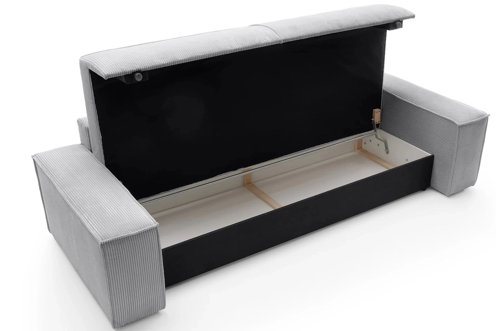 - Rozkládací tříosobová pohovka s úložným prostorem na lůžkoviny – chytré řešení pro ukládání textilu, které usnadní organizaci v obývacím pokoji