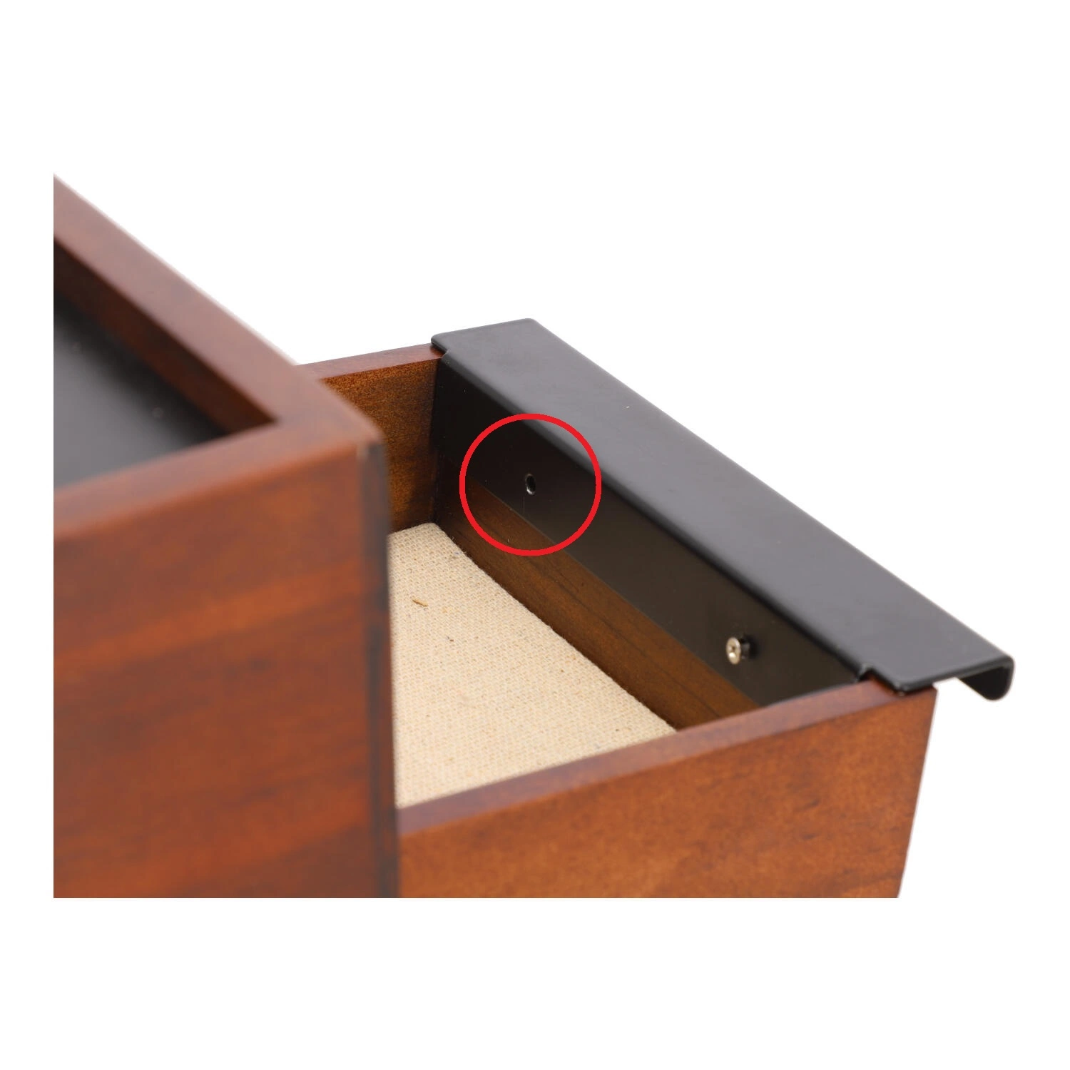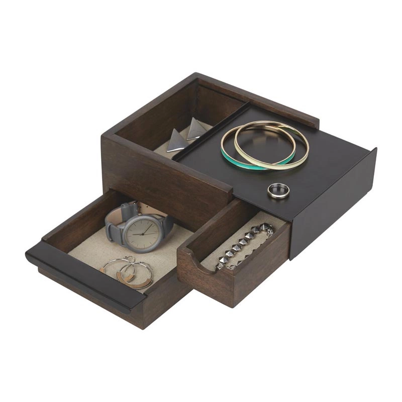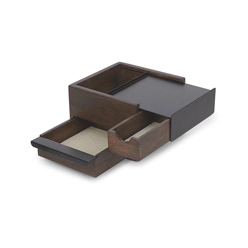 Komoda Mini Stowit obsahuje různě velké zásuvky a úložné přihrádky, takže můžete mít své oblíbené doplňky včetně prstenů, náušnic, náramků, hodinek a náhrdelníků snadno dostupné. Mini Stowit má krytý kryt se skrytými úložnými přihrádkami, aby vaše šperky zůstaly v soukromí a nebyly na očích - to znamená žádný nepořádek ! Mini Stowit má malé gumové nožičky, které jej udrží na místě, a horní povrch je odolný proti poškrábání. Uvnitř každé zásuvky je plátěný materiál, který pomáhá zajistit, aby se vaše šperky nepoškrábaly. VLASTNOSTI VÝROBKU: - kazeta proti poškrábání